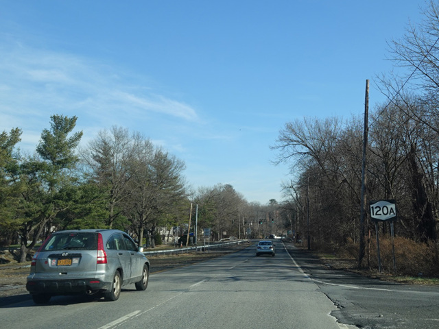 NY 120A is a north/south route in Westchester County. Westchester Avenue, which is the service road of the Cross Westchester Expressway (I-287) for much of its length, splits off after its interchange with Purchase Street (NY 120), changing designation from CR 62 to NY 120A. Westchester Avenue runs east for about a mile to Port Chester. There, NY 120A turns northeast onto North Pearl Street which it follows for a few blocks parallel to US 1. Then, it turns north onto King Street. After a couple of miles, it touches the New York-Connecticut state line and runs along it. It has an interchange with the Hutchinson Parkway and the Merritt Parkway (CT 15) at the state line. North of the parkways, King Street crosses the border into Connecticut, although there is no signage to indicate so. It retains the NY 120A designation while in Connecticut, which is a very unusual arrangement. Eventually, it crosses back into New York, and NY 120A ends just over the border at Purchase Street (NY 120), just north of exit 2 of I-684. King Street continues north as NY 120. The entire length of NY 120A is a two-lane undivided road, except for a very short stretch where Westchester Avenue widens to four lanes.