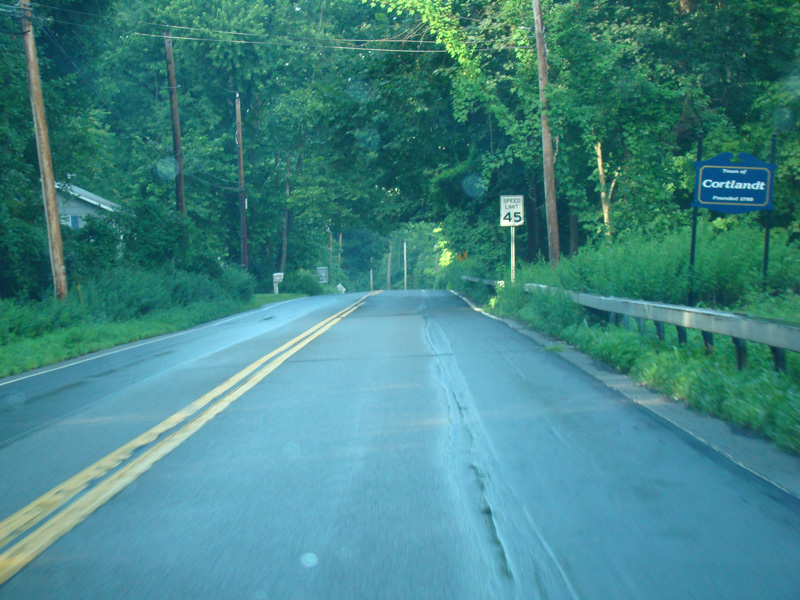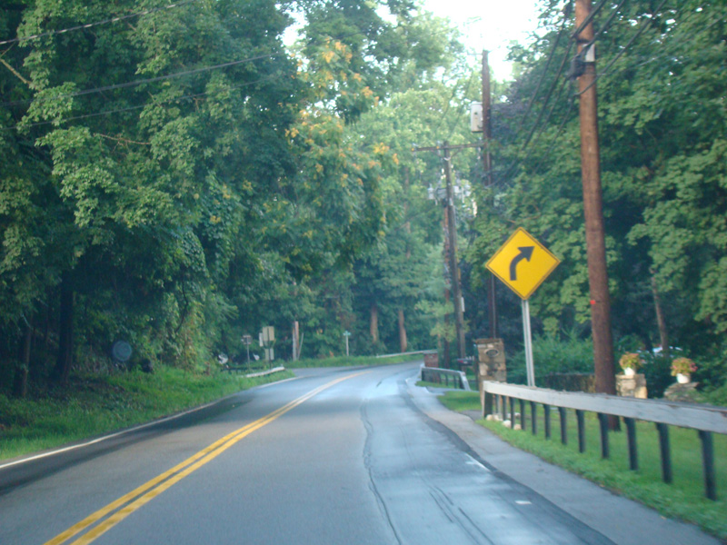 Croton Lake Road ends here at Saw Mill River Road (NY 118). The intersection is controlled by a flasher. Continue straight ahead to go south or turn left to go north.
