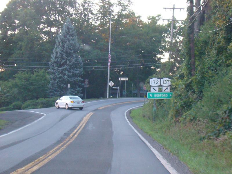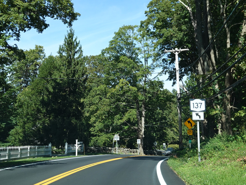 After a short distance, Westchester Avenue ends and the roadway splits. Bear left onto Stone Hill Road to stay on NY 137. Bear right for Salem Road (NY 124), which begins here.