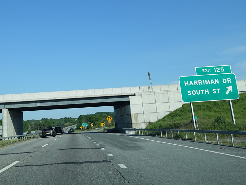 Exit 125 is for Harriman Drive and South Street. Exit here for NY 17M east, which splits off from the Quickway at this point. NY 17/US 6 continues straight ahead.