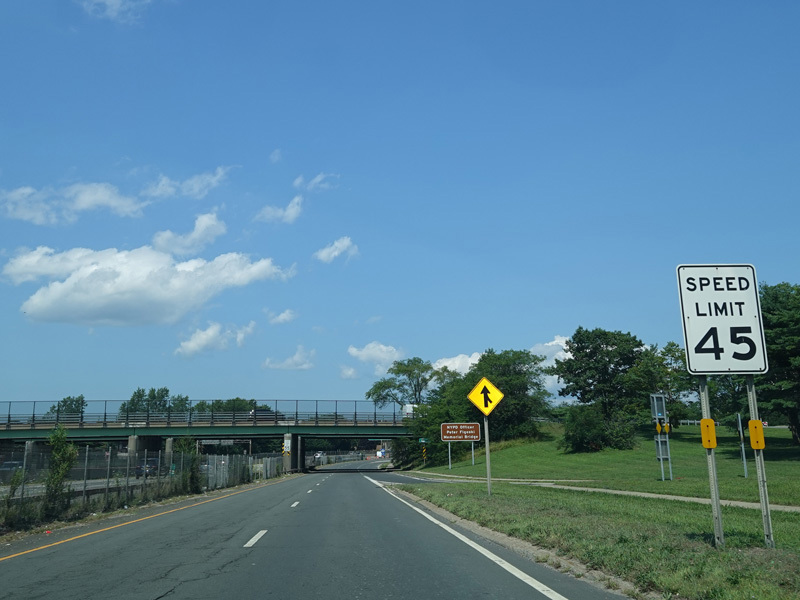 The service roads narrows down to a single lane again, and Veterans Highway (NY 454) merges in on the left.