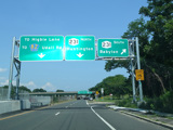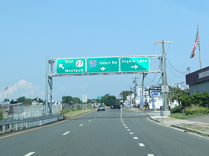 There is an exit on the right for Higbie Lane, followed by an entrance to Sunrise Highway on the left.