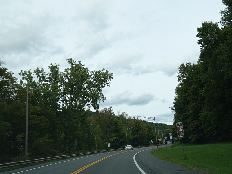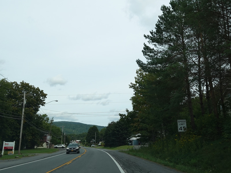 Skipping south to Margaretville, NY 28 is multiplexed with NY 30. It runs east through the mountains as a two-lane undivided road.