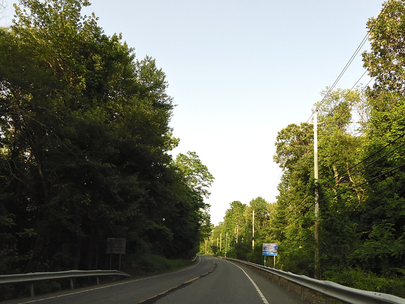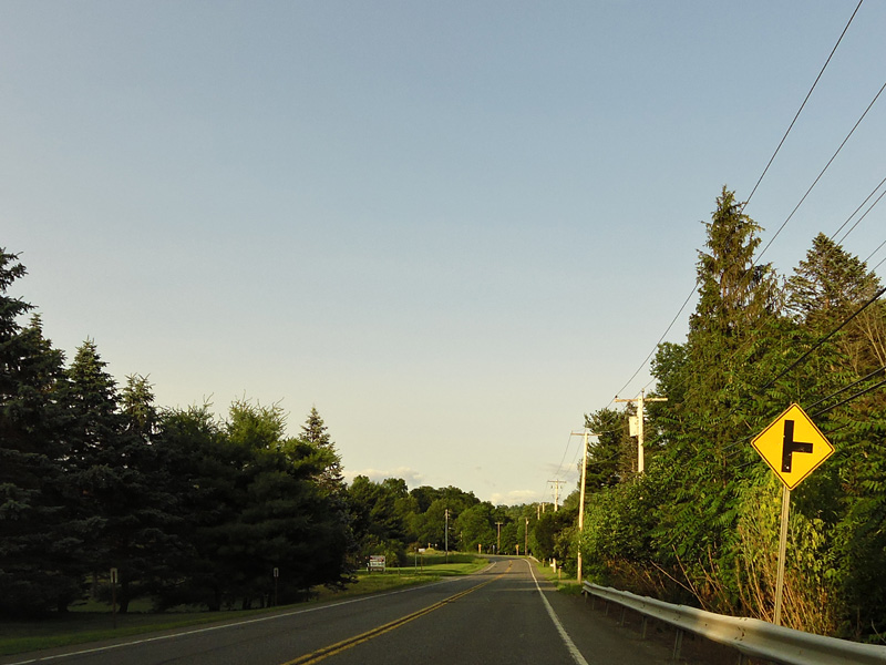 NY 308 ends here at NY 199. Turn left at the signs to go west. Merge in straight ahead at the traffic light to go east.