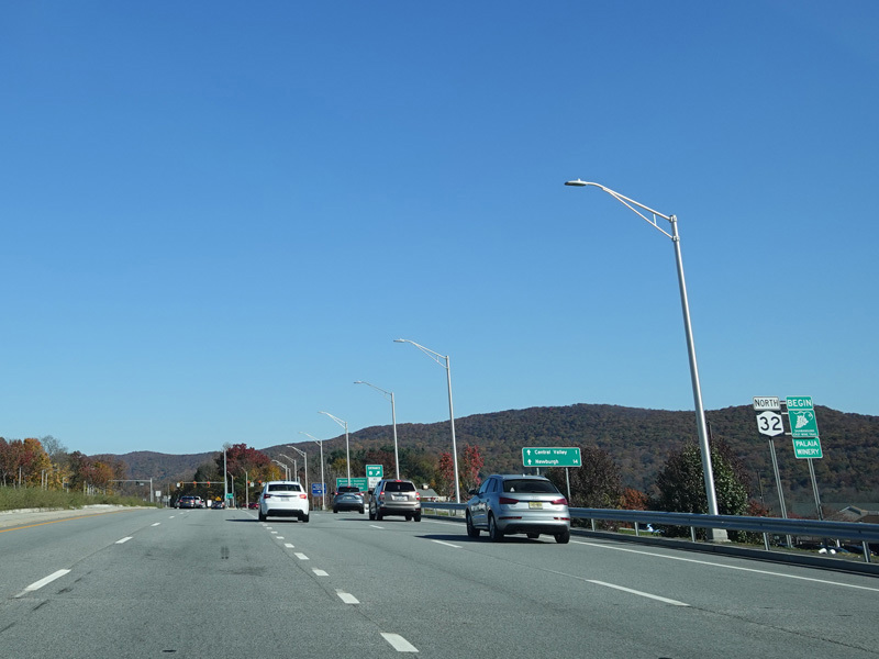 NY 32 begins in Harriman at the point where NY 17 turns from Averell Avenue onto the Quickway. At first, it is a four-lane divided highway. There are entrances to Woodbury Common Premium Outlets on the right.