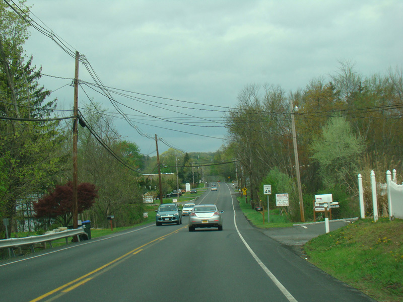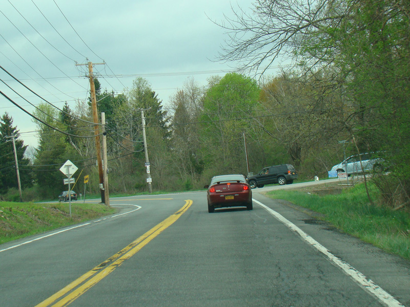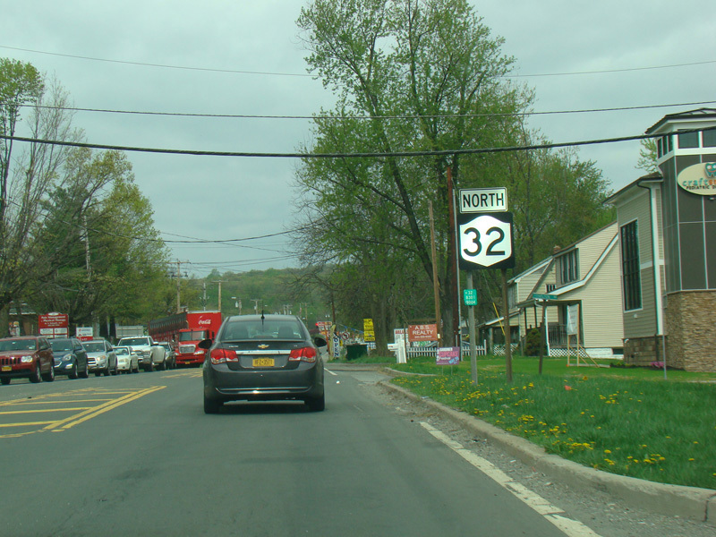 Just past the outlet mall, the median ends, and NY 32 narrows down to two lanes.