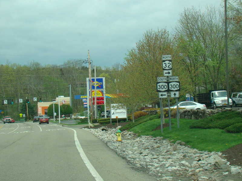 There is a traffic light at NY 300. Continue straight ahead to go north or turn left to go south. Turn right to stay on NY 32.