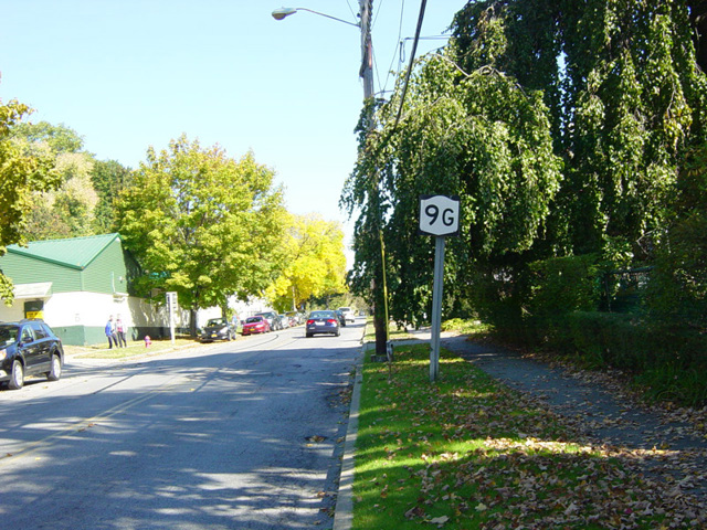NY 9G is a north/south route in the Hudson Valley. It begins at US 9 across from the entrance to Marist College in Poughkeepsie. It runs east as Marist Drive for a very short distance and then curves to the south and becomes Washington Street. After a few blocks, it turns east onto Parker Avenue, which gradually curves to the north and becomes Violet Avenue. NY 9G runs north, parallel to US 9, to Rhinebeck, where the two routes cross. NY 9G is the westernmost north/south route on the east side of the Hudson River from Rhinebeck to Hudson. It ends at US 9 in Hudson. Most of NY 9G is a two-lane undivided road.