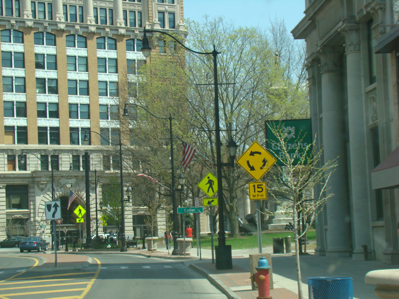 Court Street runs east through Binghamton as a two-lane undivided road. There are traffic lights at Washington Street and State Street (NY 434), followed by a traffic circle. There is no route signage for NY 434 here.