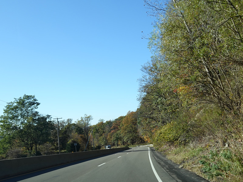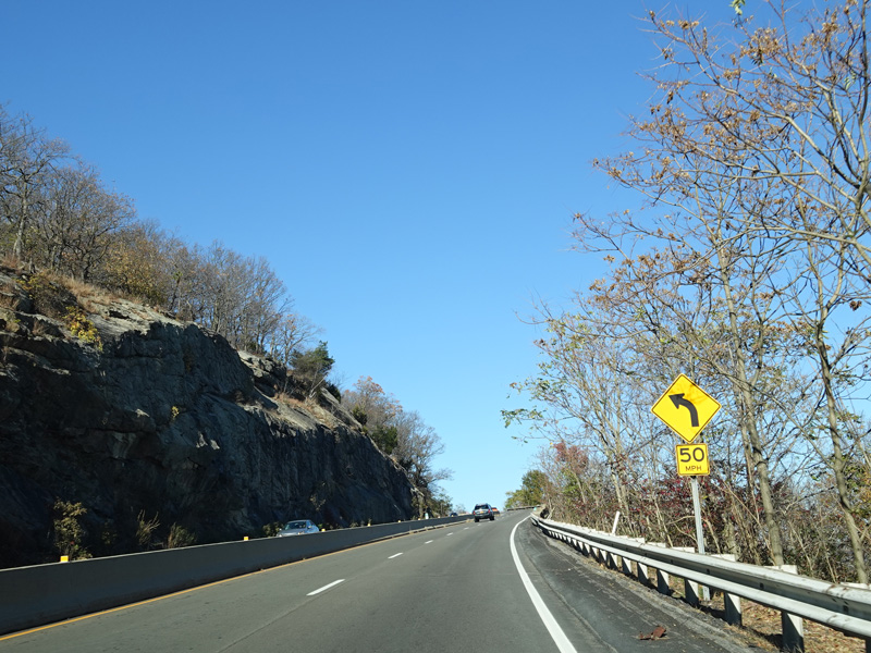 US 9W ascends Storm King Mountain and then comes down the other side. There are no exits on the mountain, although there is a parking area on the way down.