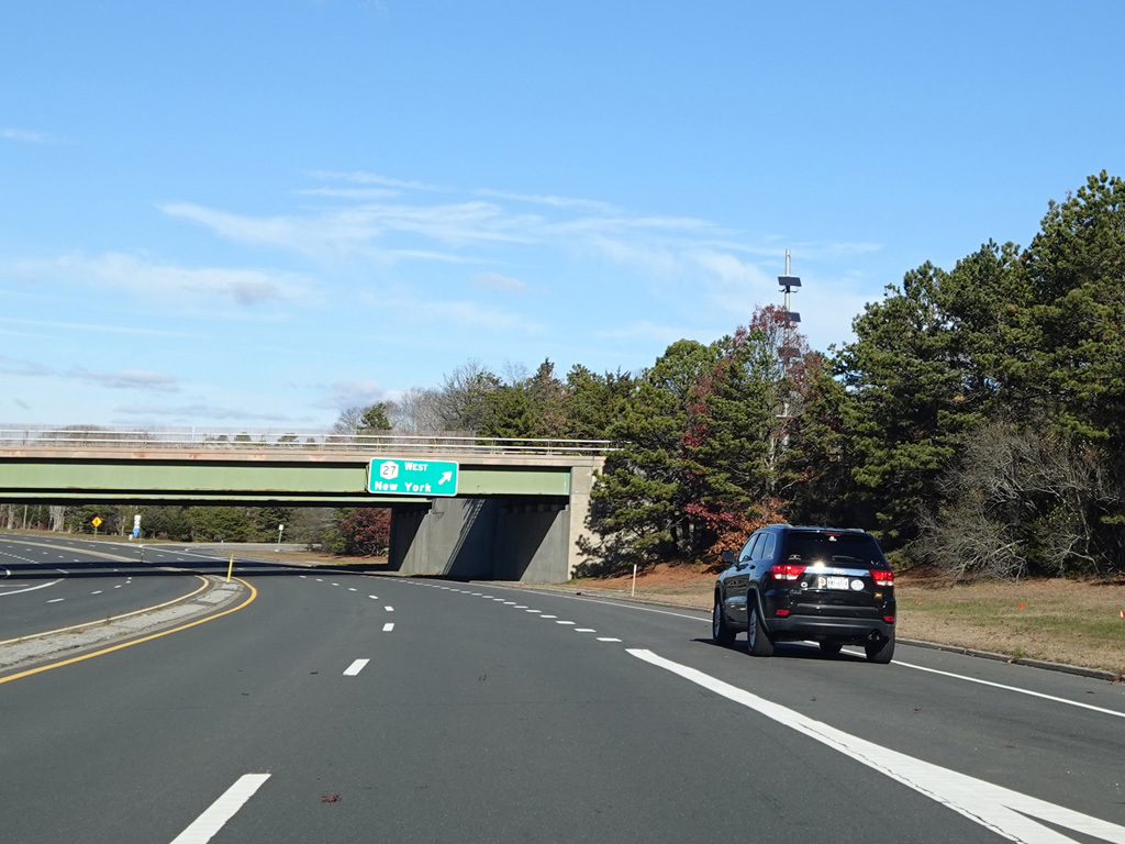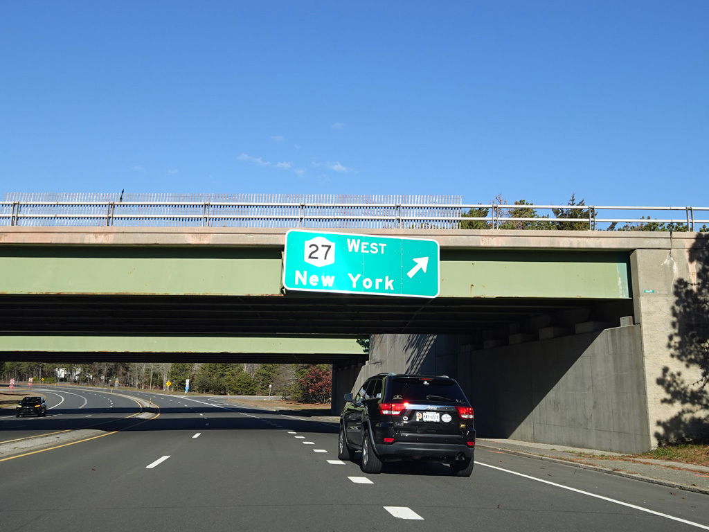 Quogue-Riverhead Road widens to become a four-lane divided highway. There is an interchange with Sunrise Highway (NY 27).