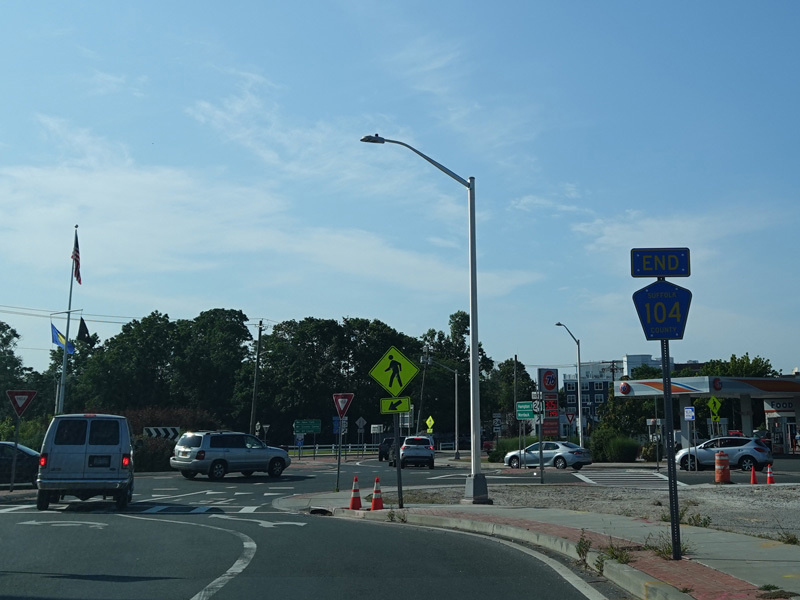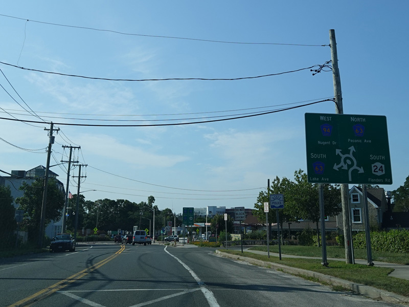 Riverleigh Avenue ends at a traffic circle at Flanders Road (NY 24), Peconic Avenue (CR 63), Nugent Drive (NY 24/CR 94), and Lake Avenue (CR 63).