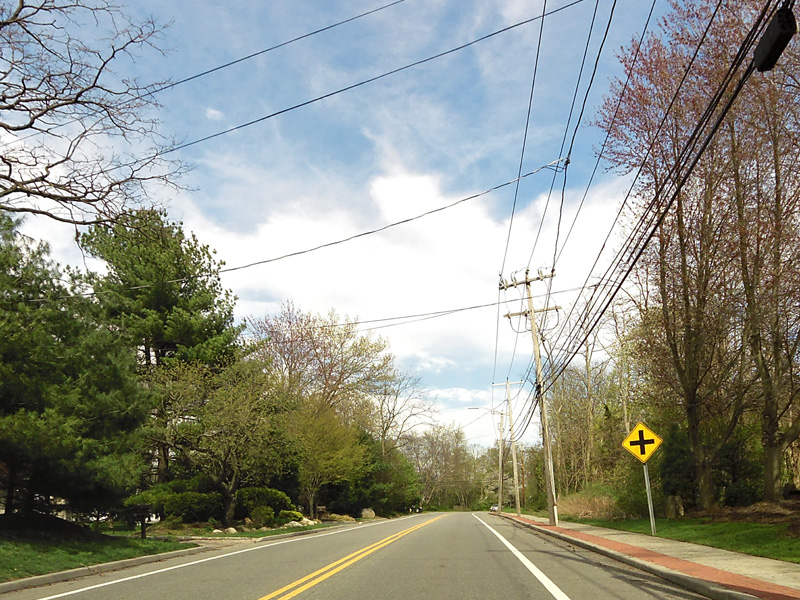 The intersection with Meadow Glen Road in Fort Salonga was uncontrolled until 2019. A traffic light has since been installed here.