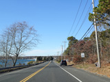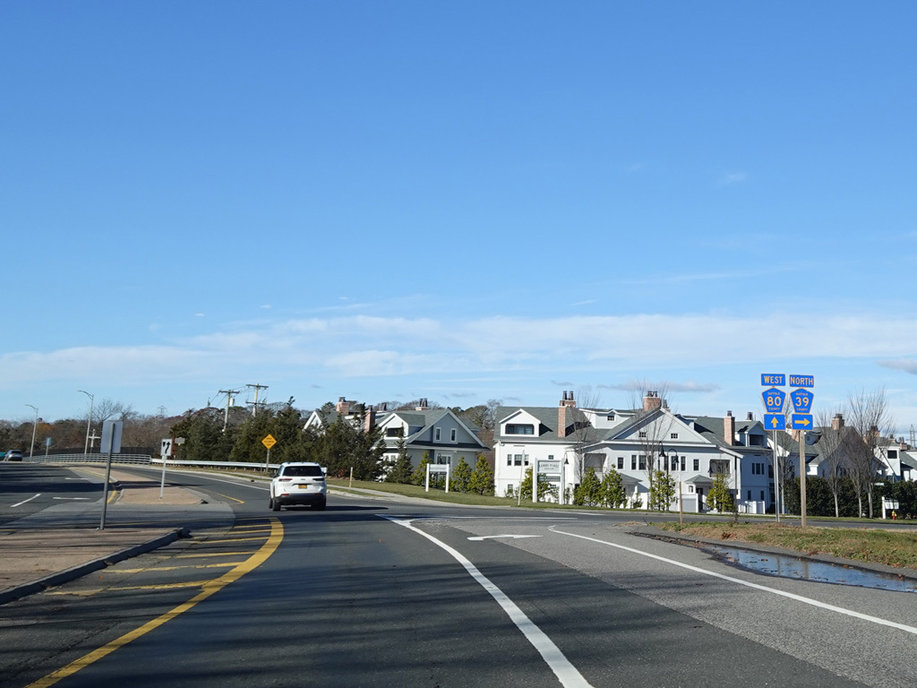 Montauk Highway widens to become a divided highway in the area of the Shinnecock Canal. North Road (CR 39) begins on the right.