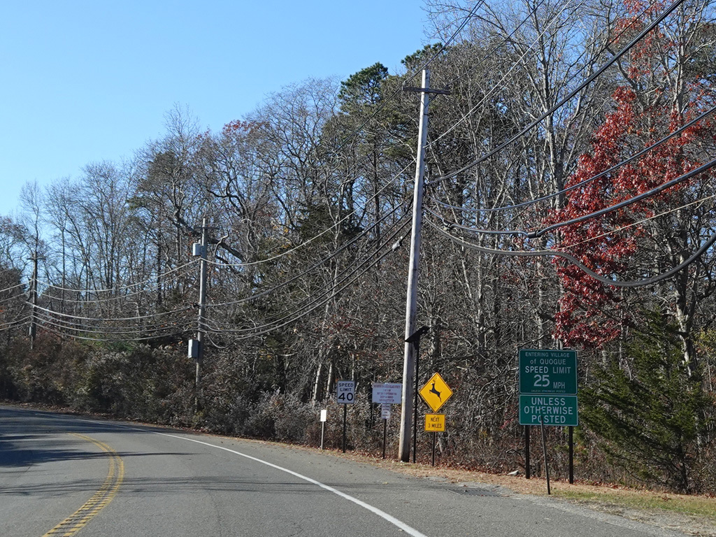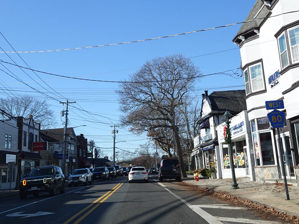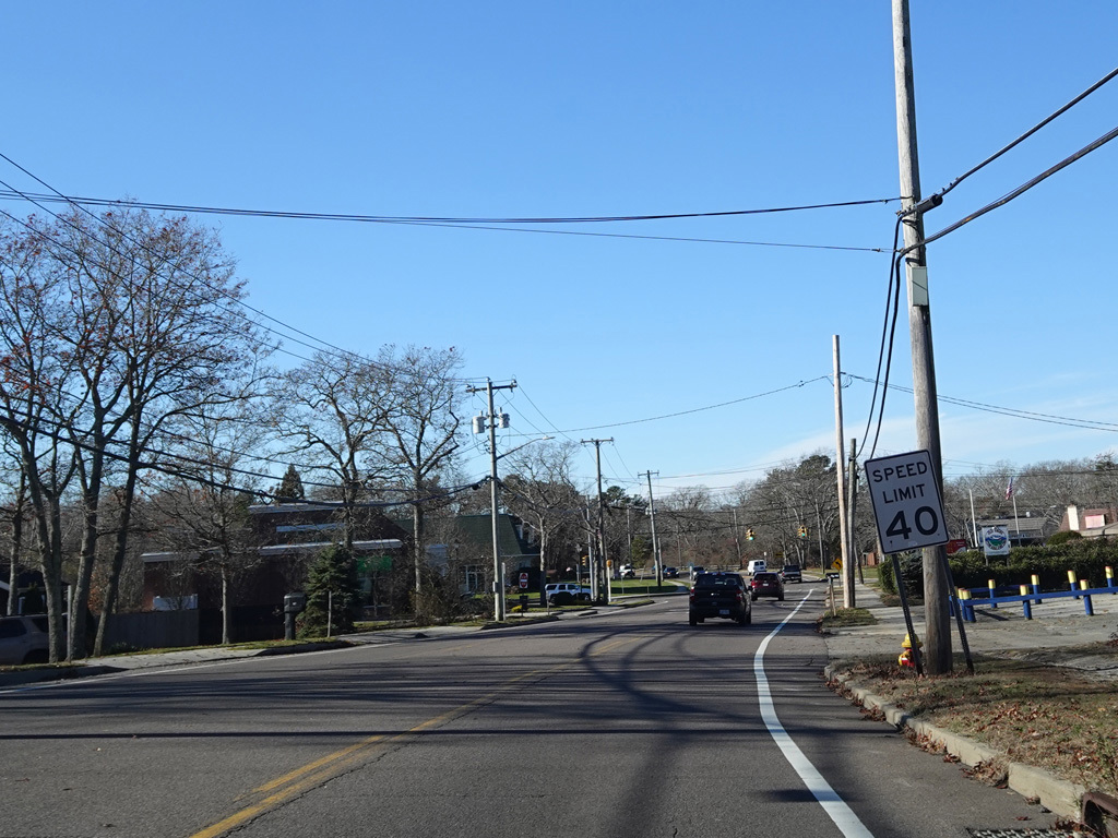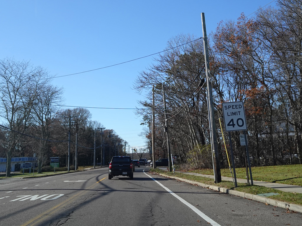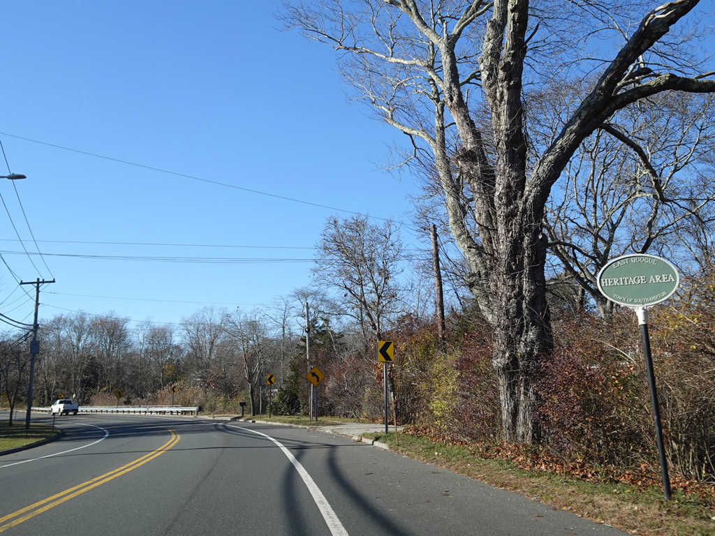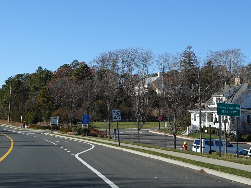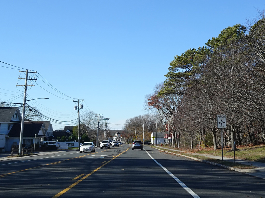 The median ends. Montauk Highway runs west toward Hampton Bays at a two-lane undivided road.