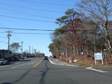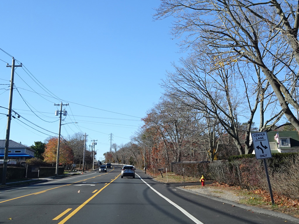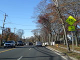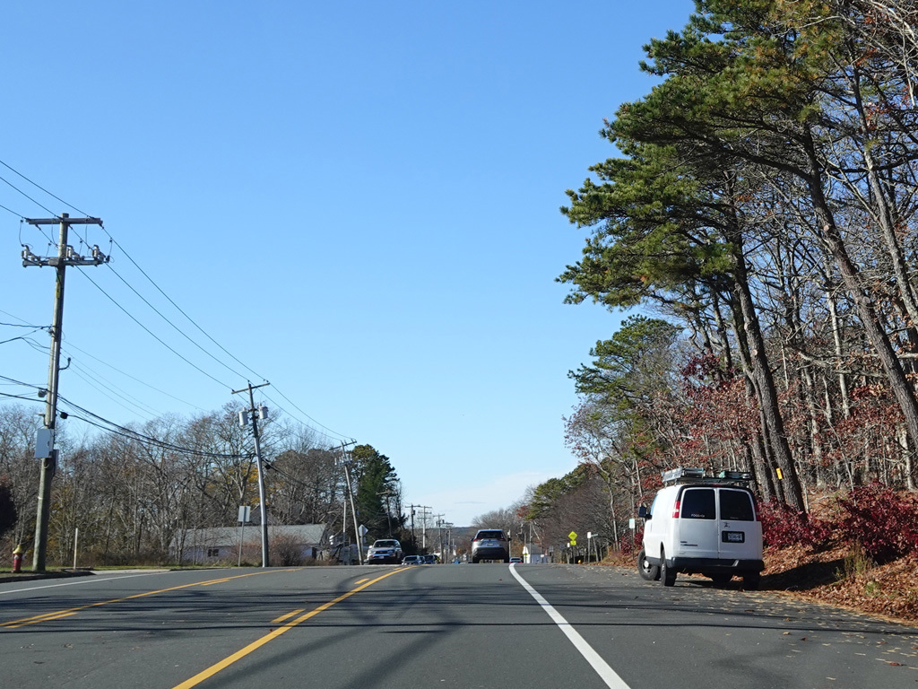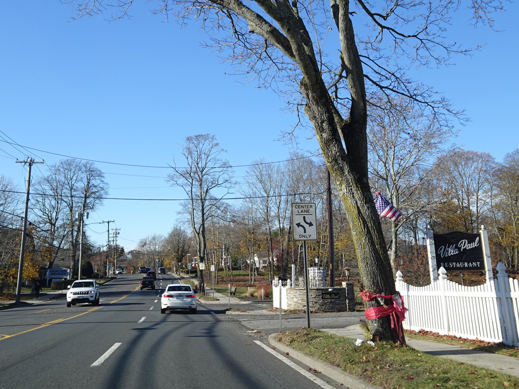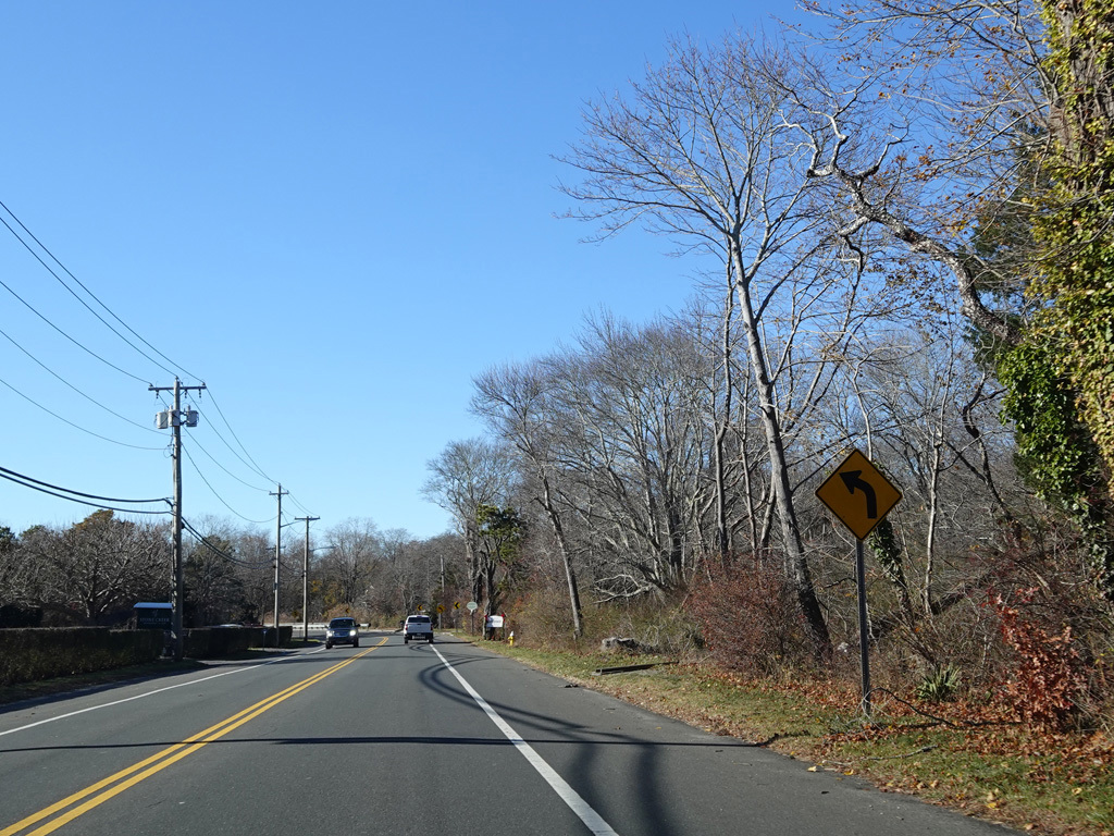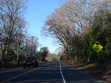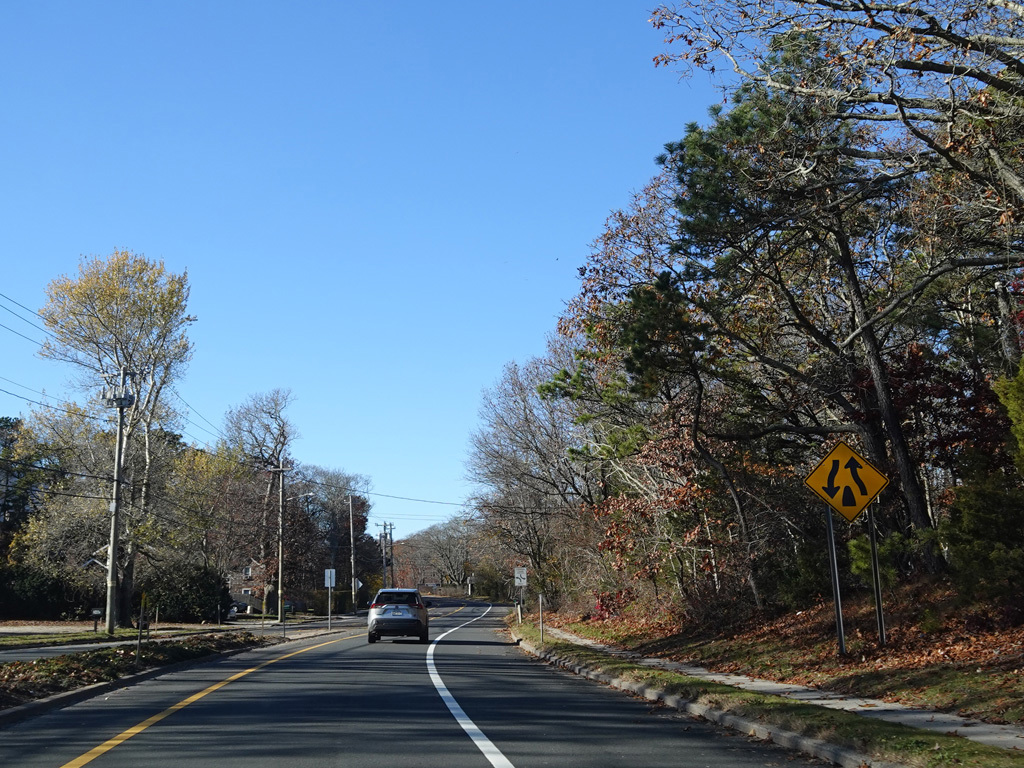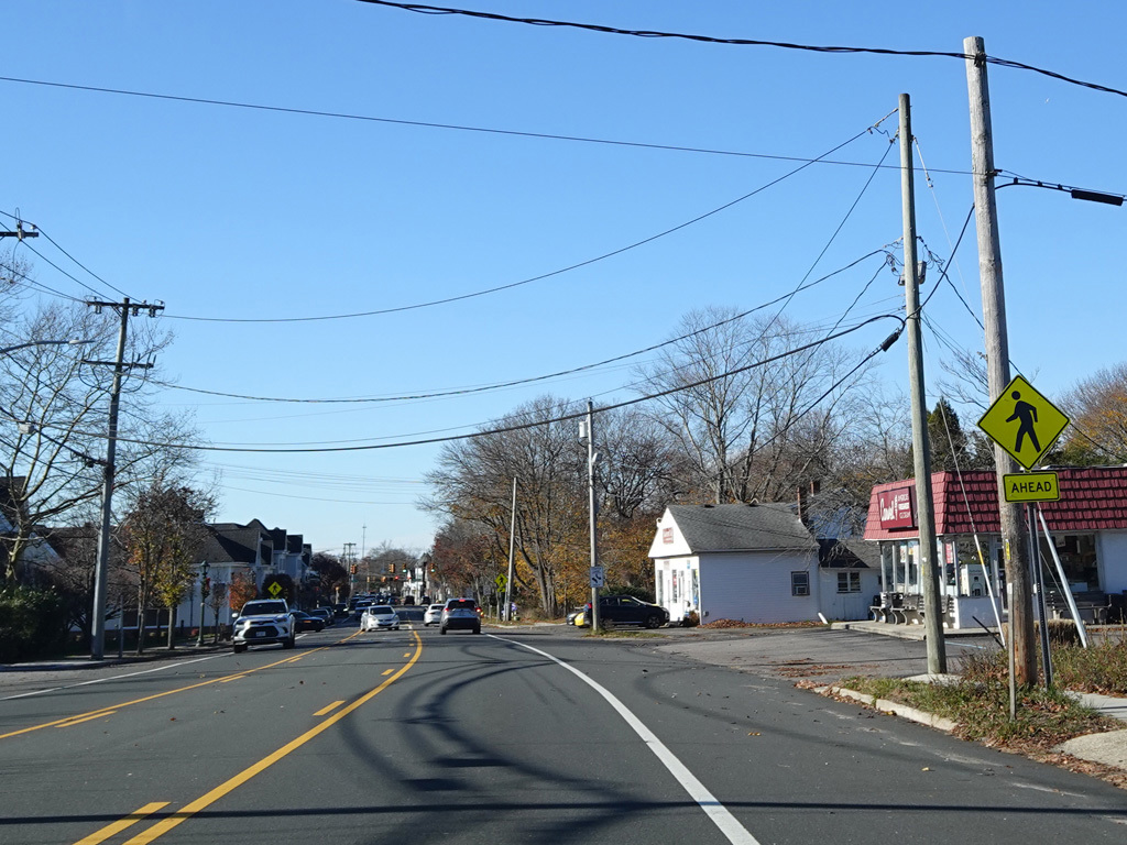 The median ends. Montauk Highway runs west toward Hampton Bays at a two-lane undivided road.