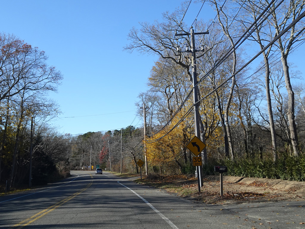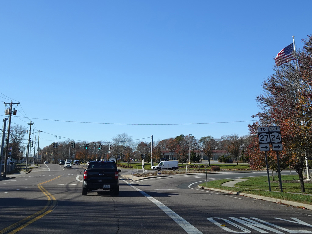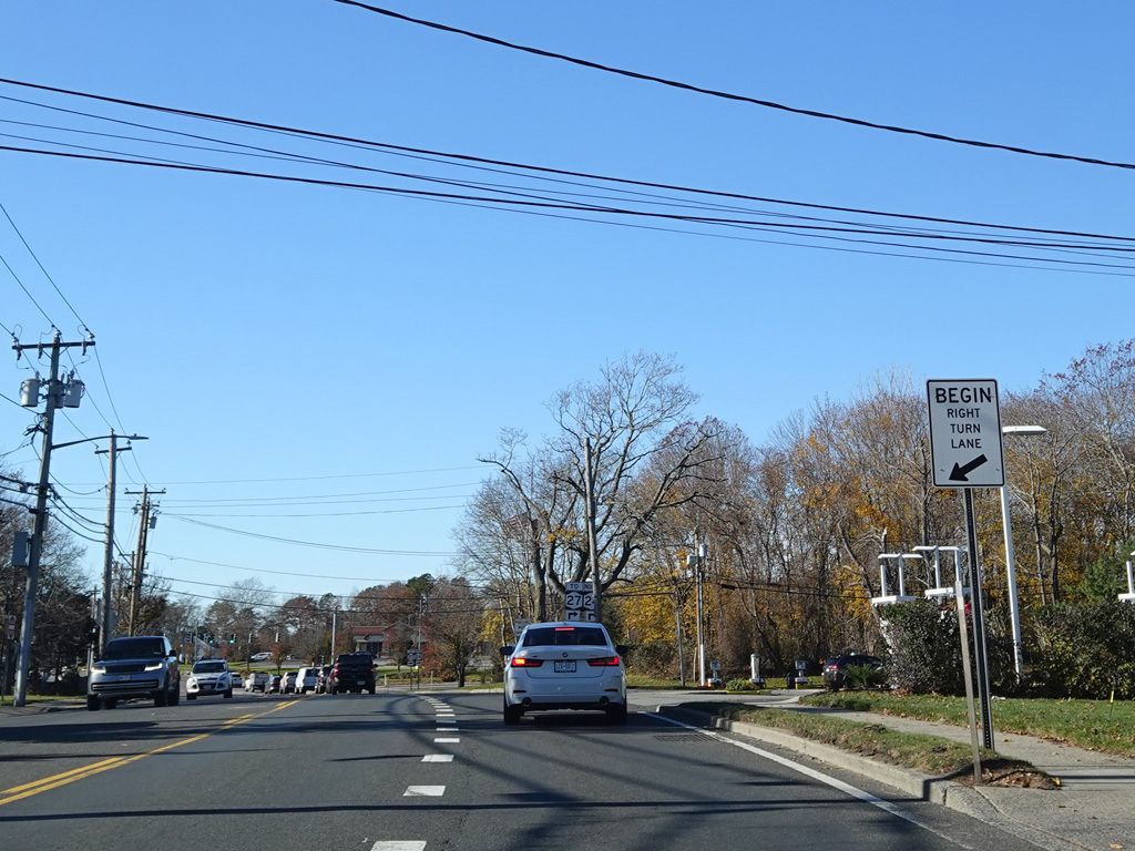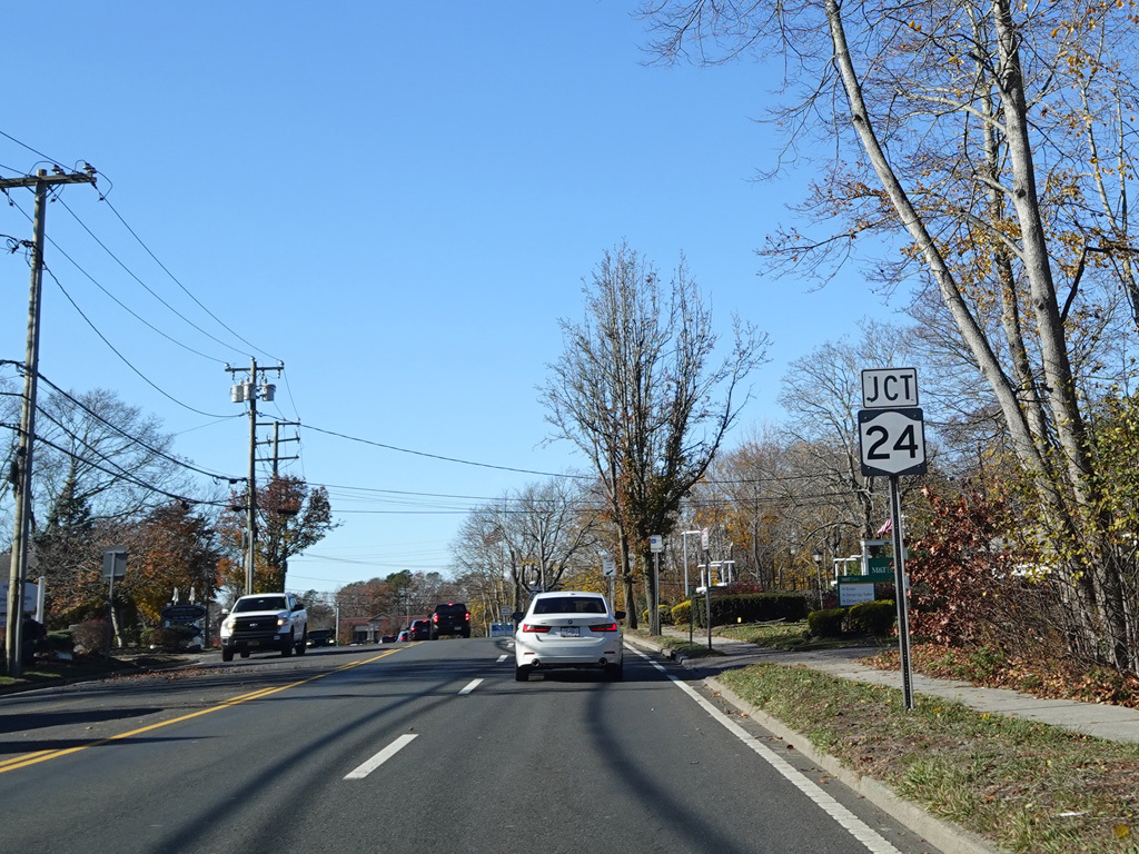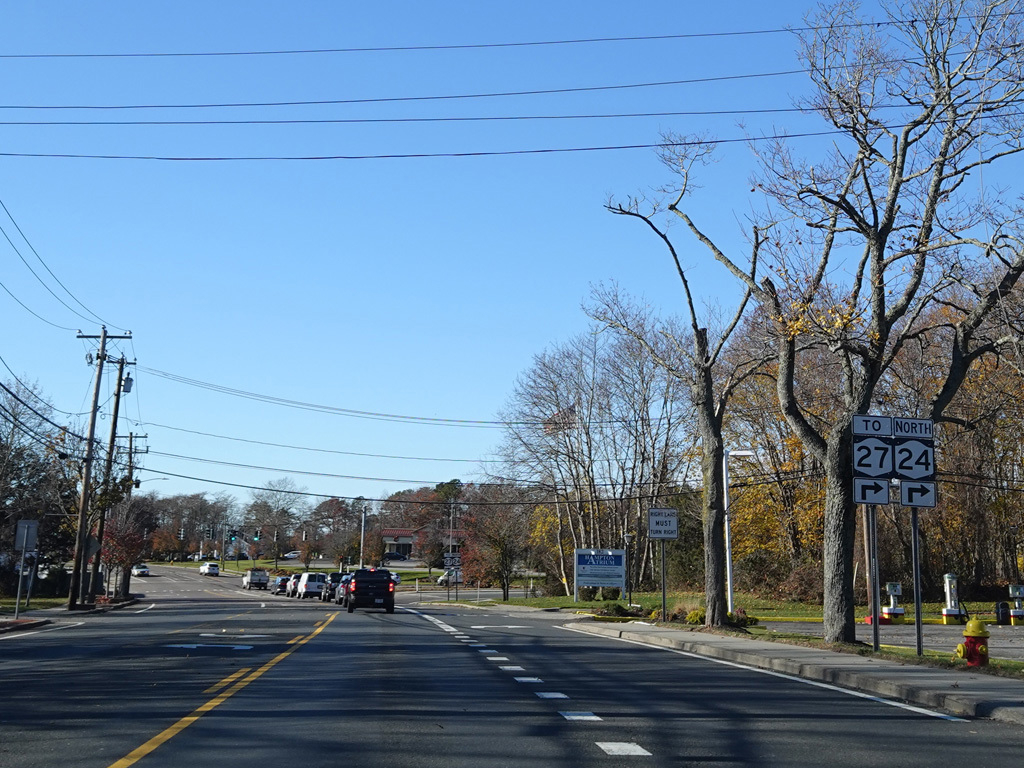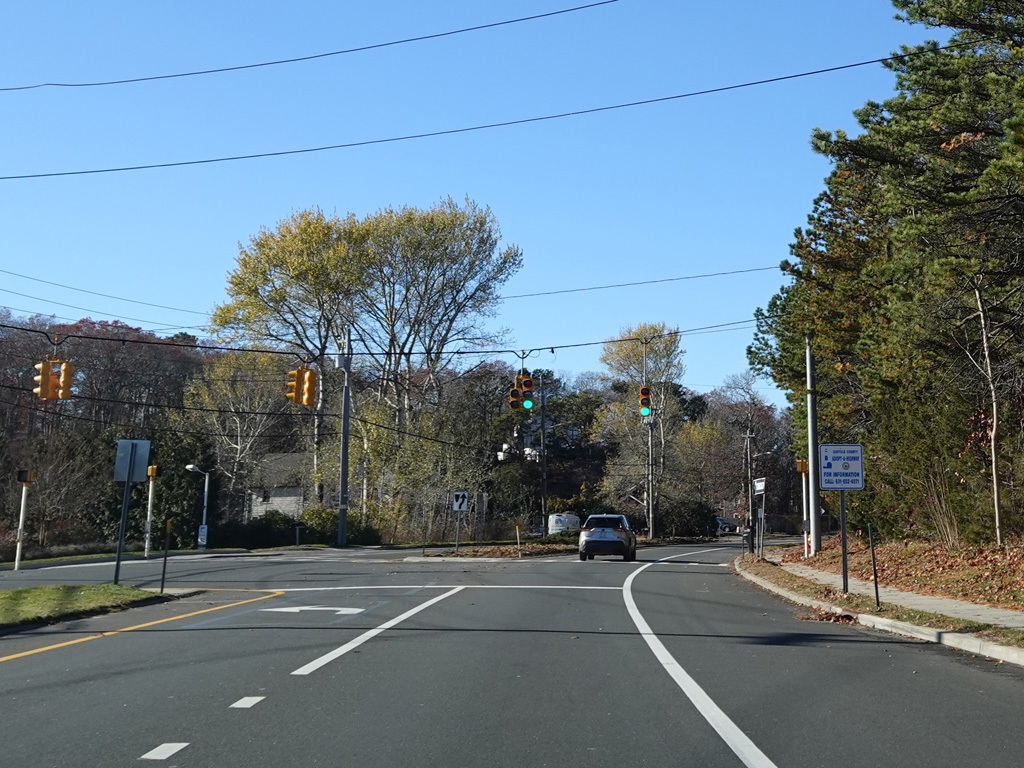 Riverhead-Hampton Bays Road (NY 24) begins on the right here. Turn right for access to Sunrise Highway (NY 27).
