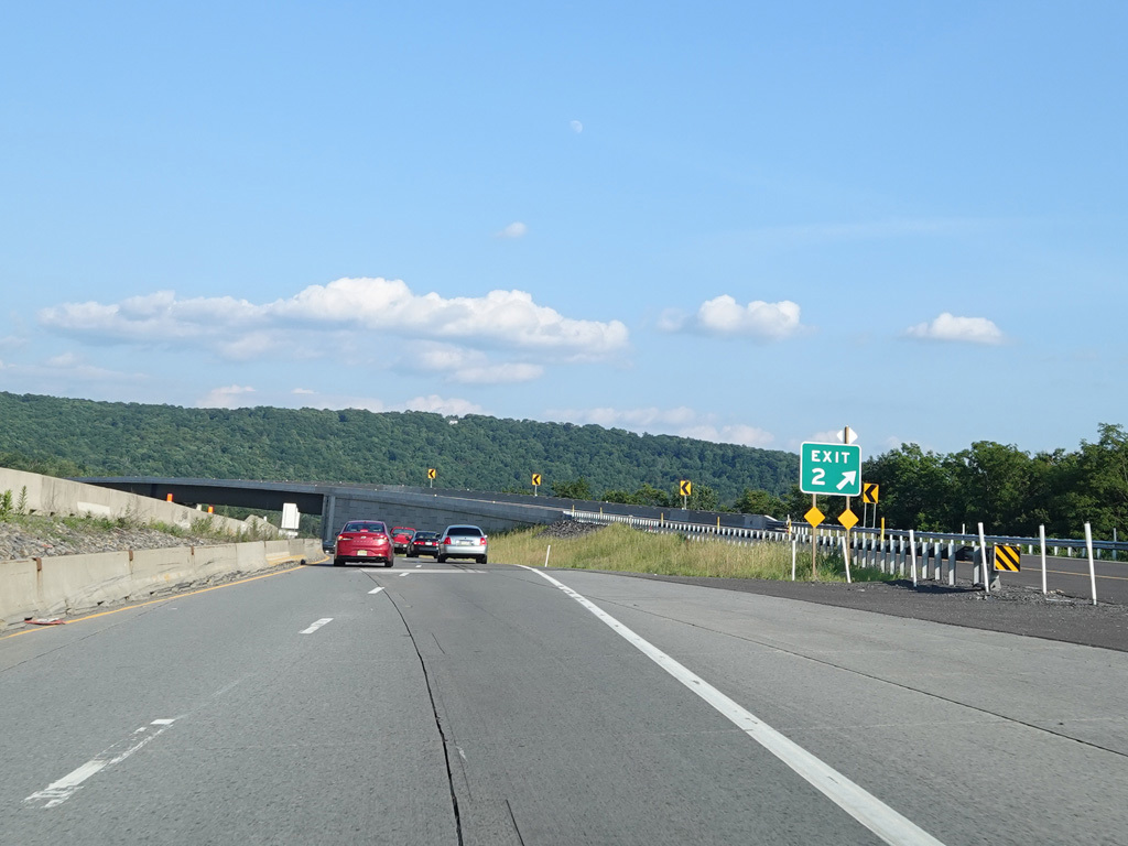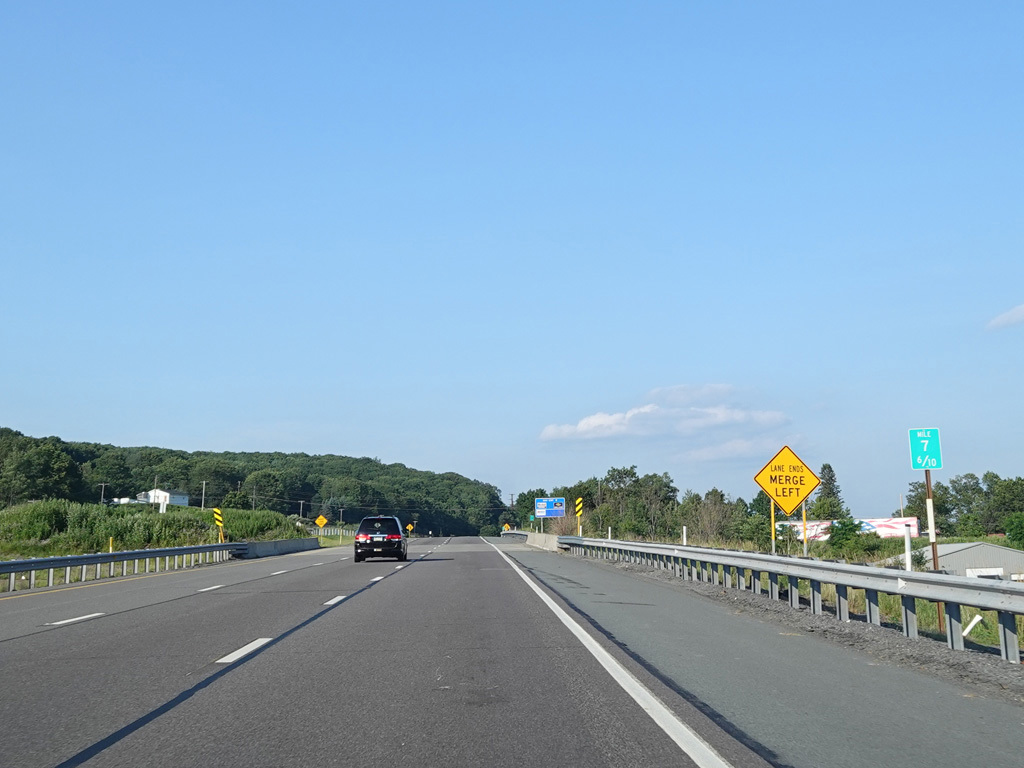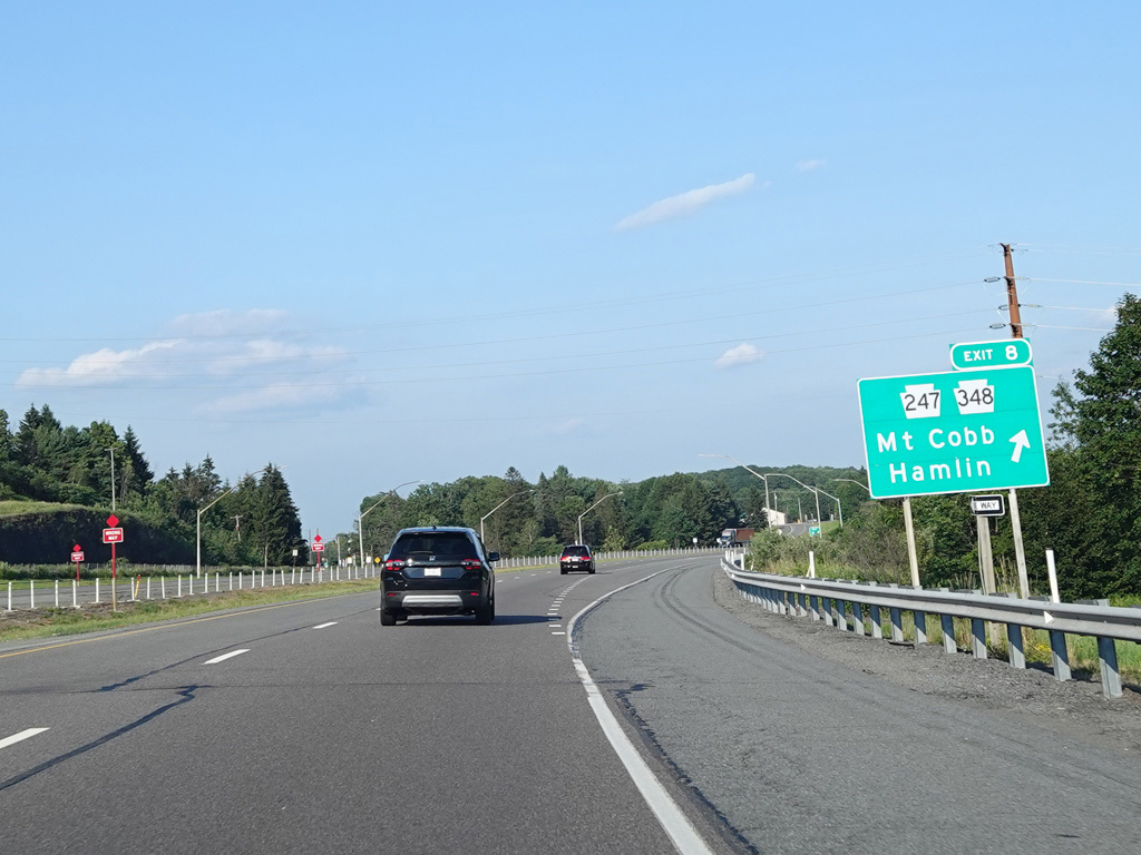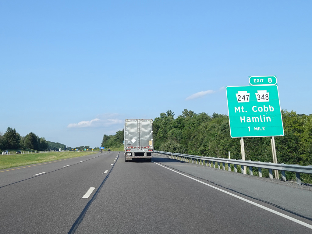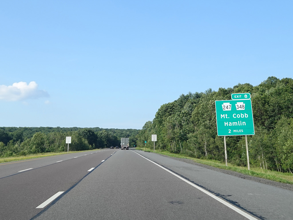 East of exit 4, there is a third northbound lane as the highway goes uphill. Exit 8 is for PA 247 and Mount Cobb Road (PA 348).