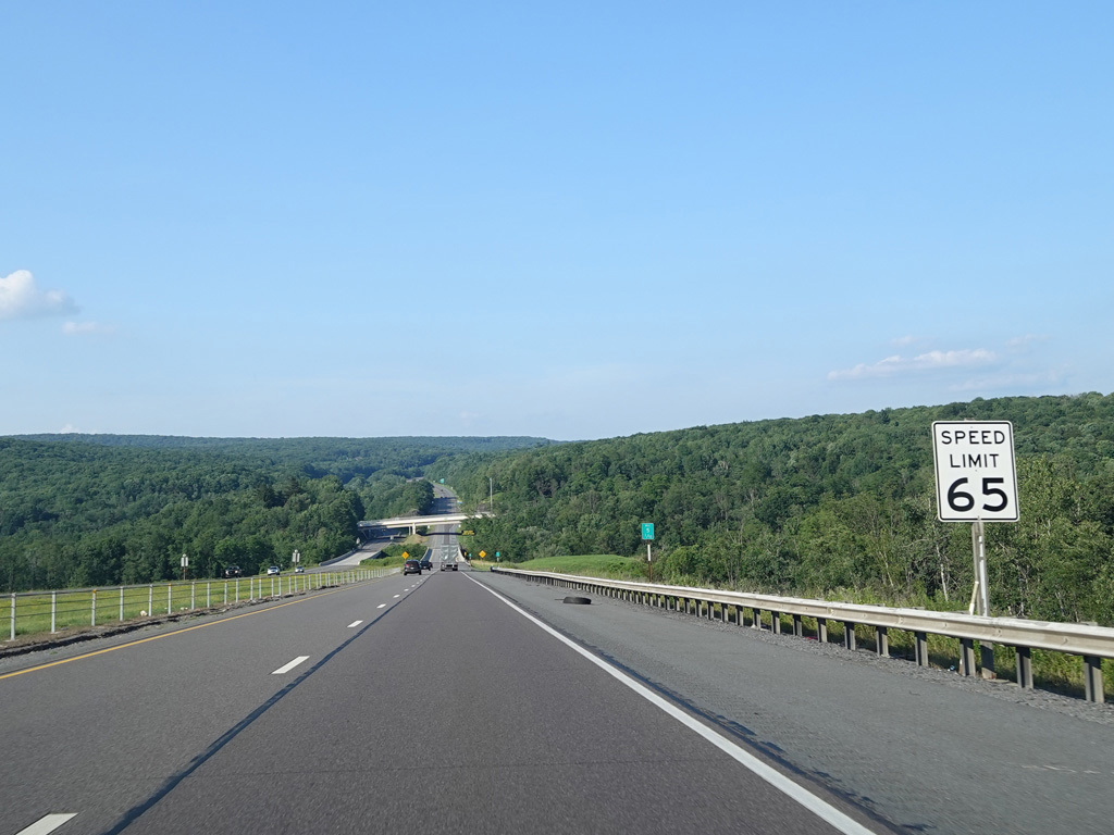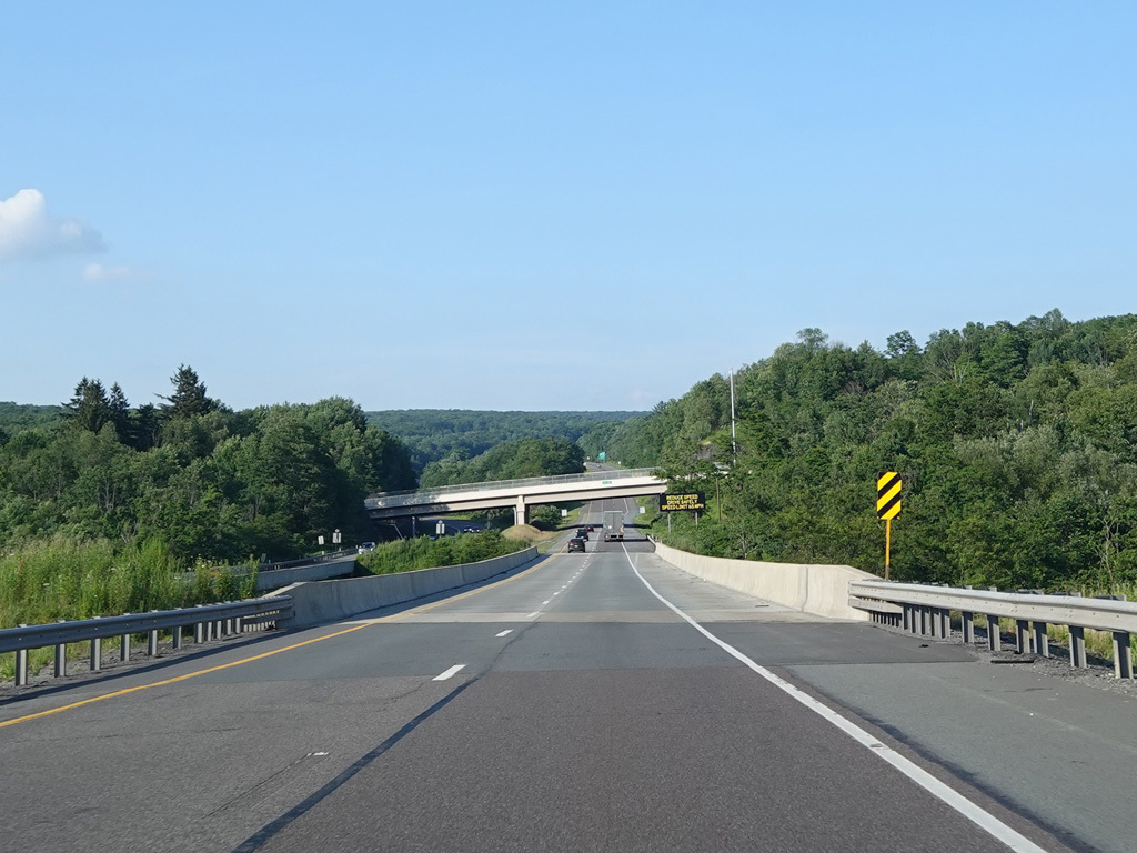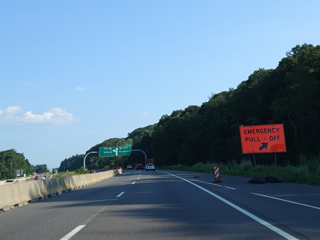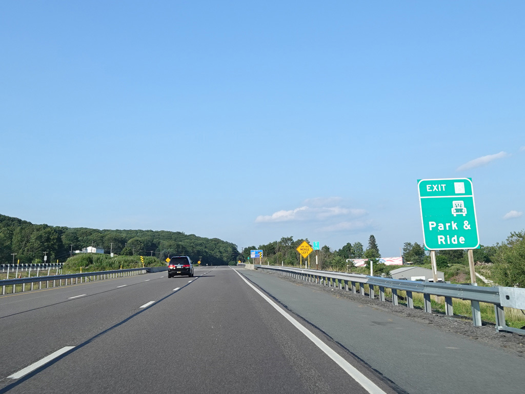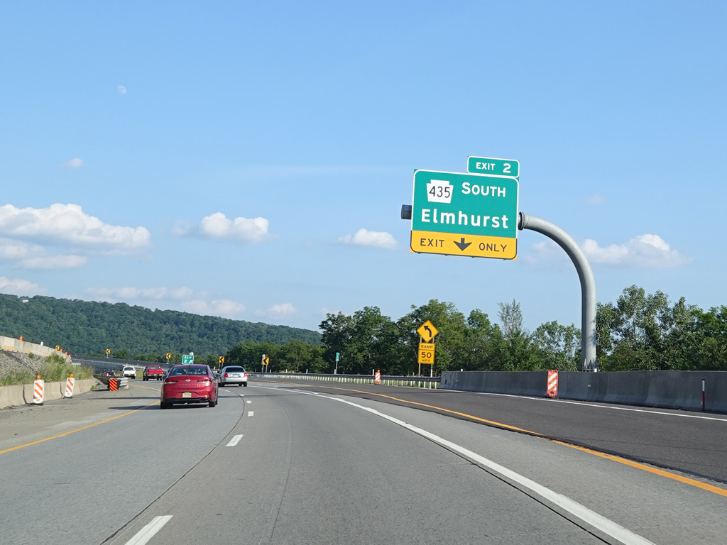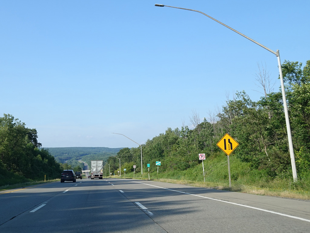 East of exit 4, there is a third northbound lane as the highway goes uphill. Exit 8 is for PA 247 and Mount Cobb Road (PA 348).