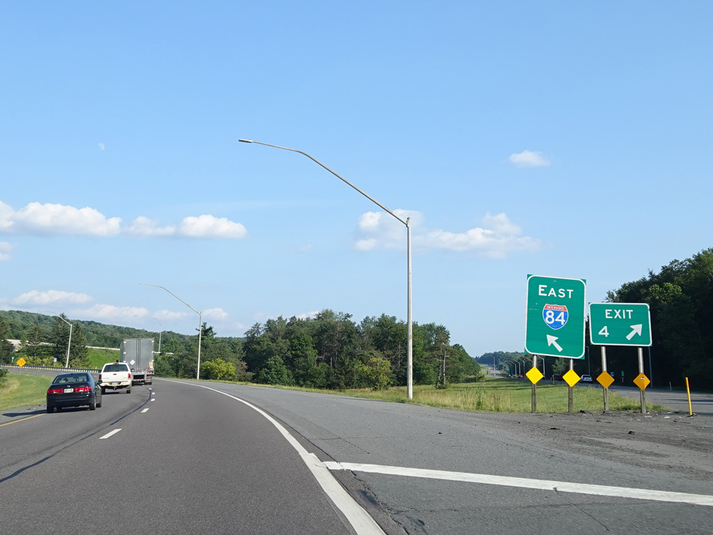 Exit 4 is for I-380 south. The two routes split here. While I-380 is signed as an exit from I-84, the interchange is built as if it were I-84 taking a left exit from I-380.