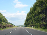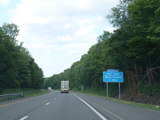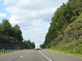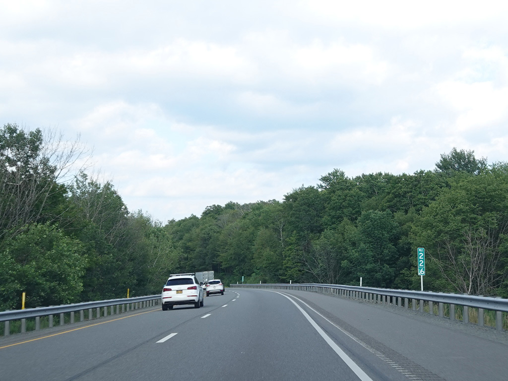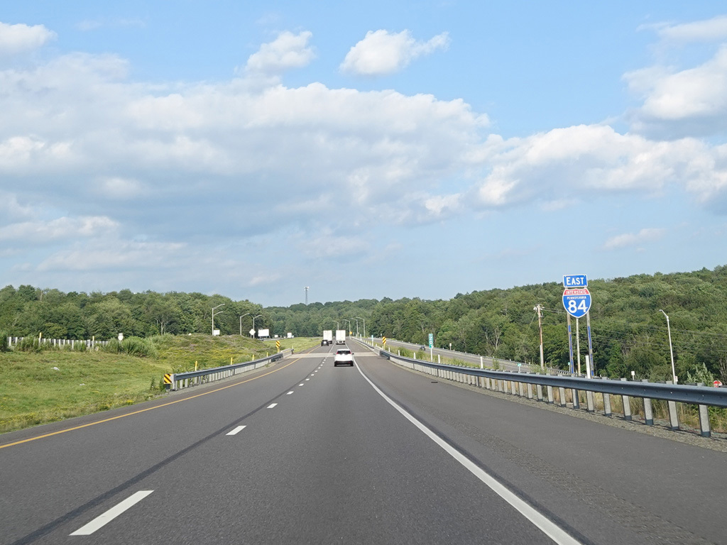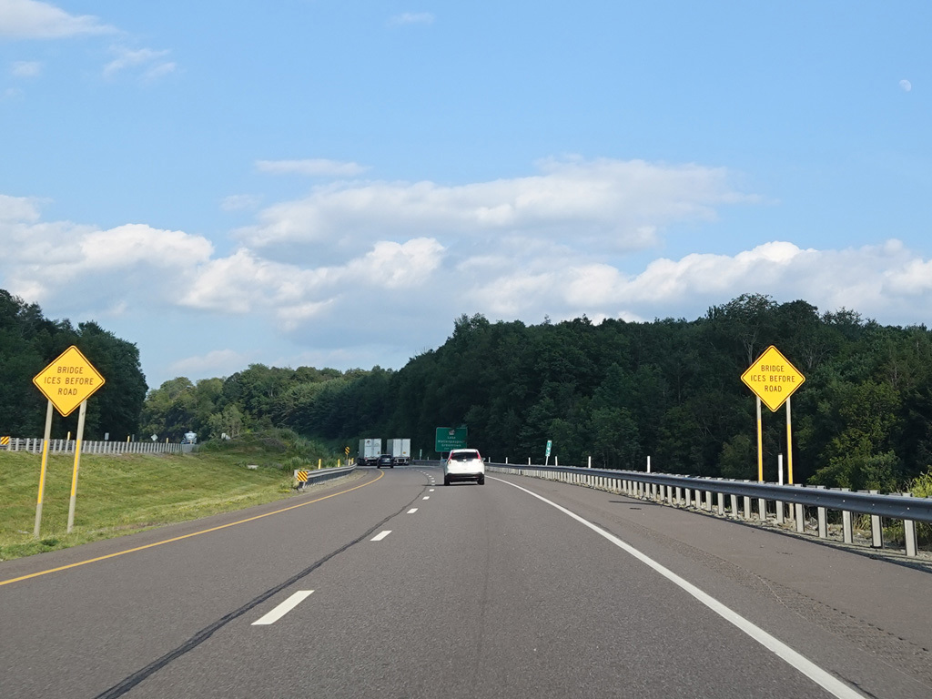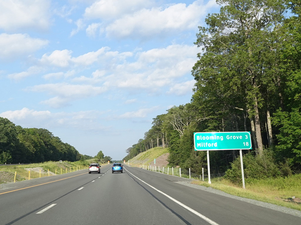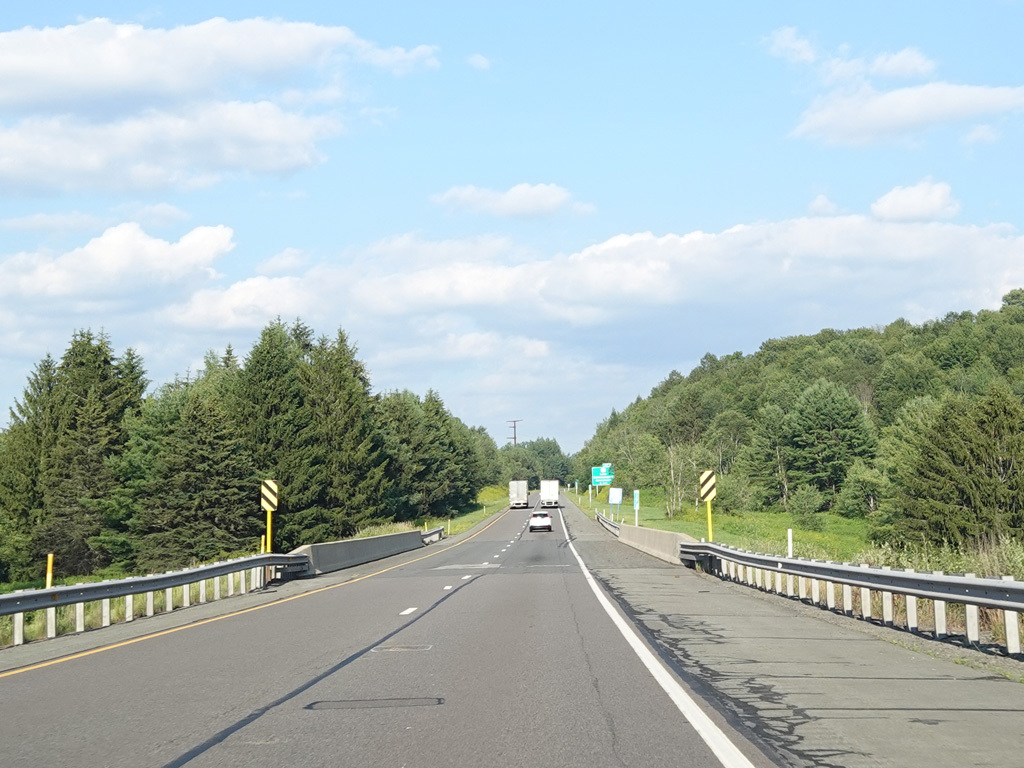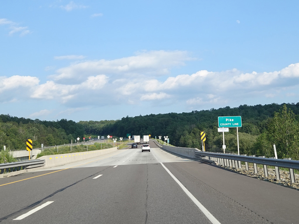 Approaching the state line, there is advance signage for exit 1 in New York, which is for US 6 and NJ 23. The sign is in Pennsylvania, the exit is in New York, and it references a state route in New Jersey. Straight ahead, there is a bridge over the Delaware River to New York.
