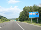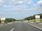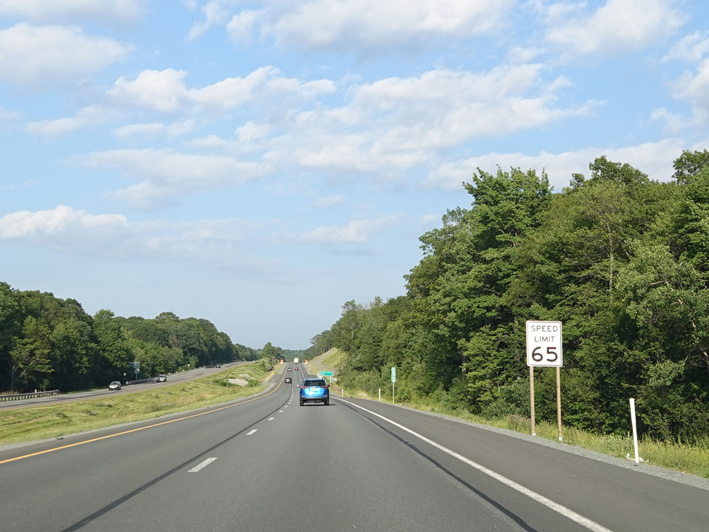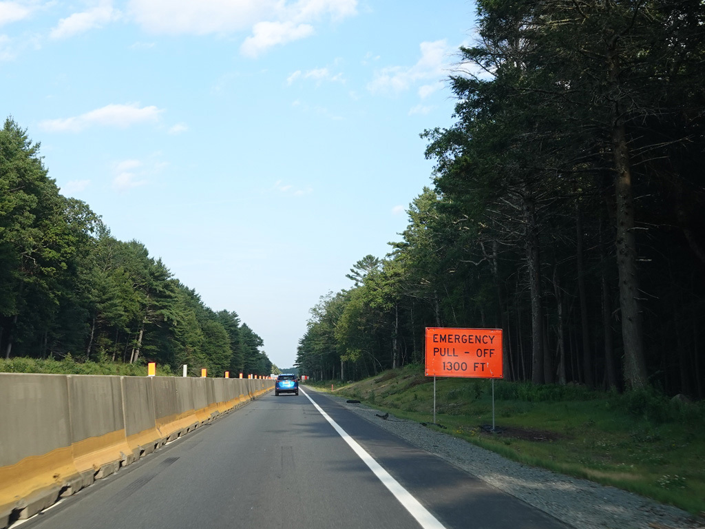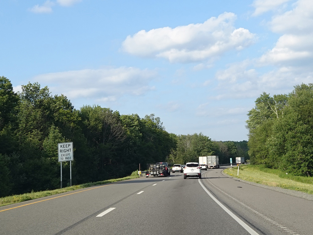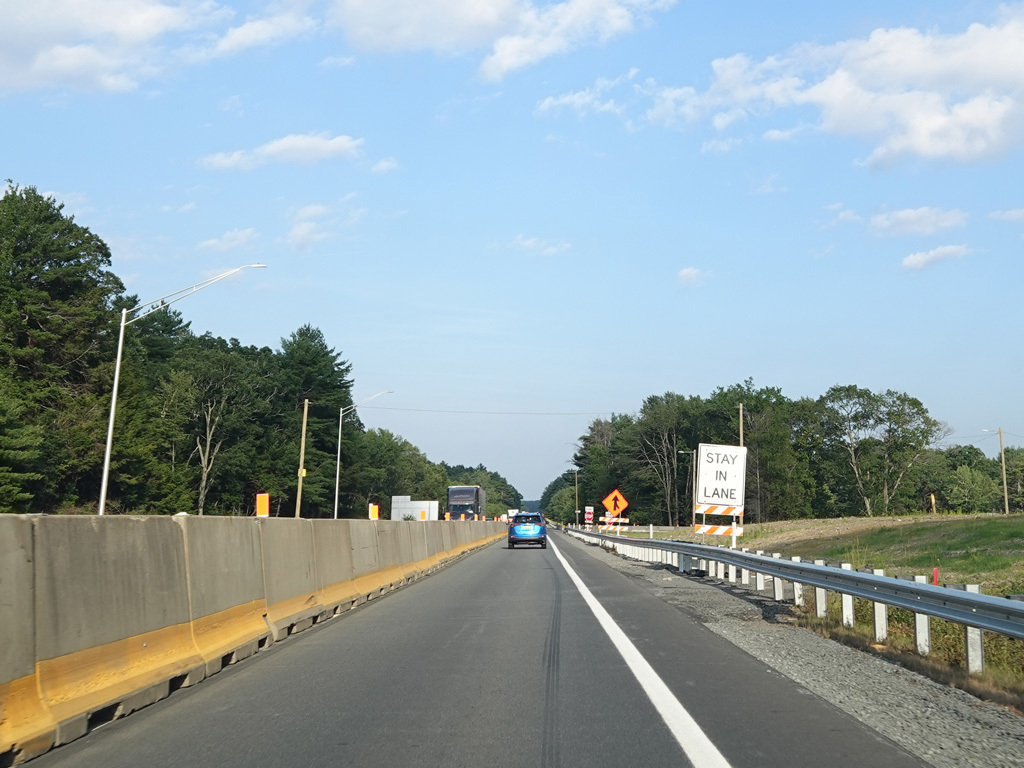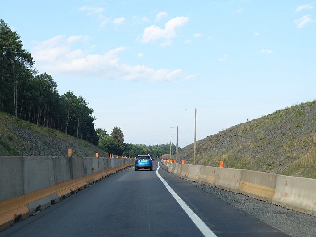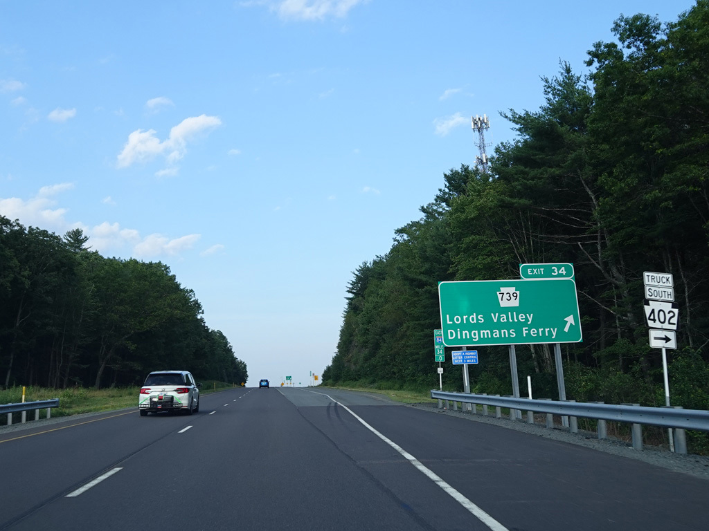 Exit 34 is for PA 739. Due to construction, all traffic is forced into what are normally the westbound lanes, with one lane for each direction. This arrangement ends just before the exit.