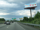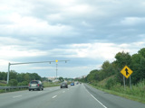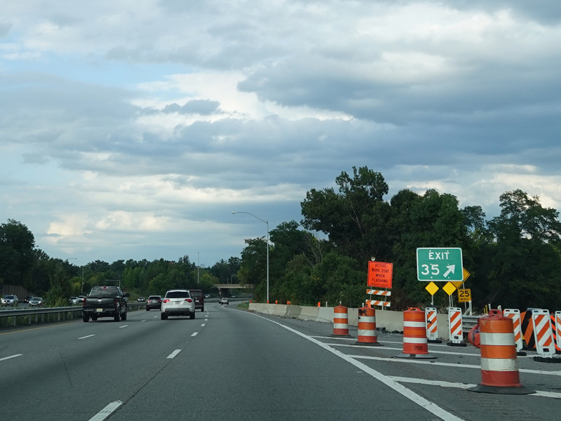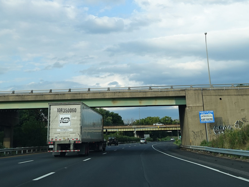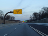 A third lane merges in from the right, and then the highway narrows back down to two lanes approaching the Delaware River Bridge. There is a cashless tolling gantry for southbound traffic, but there is no toll in this direction.