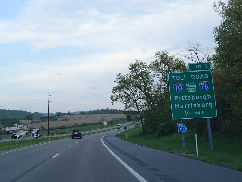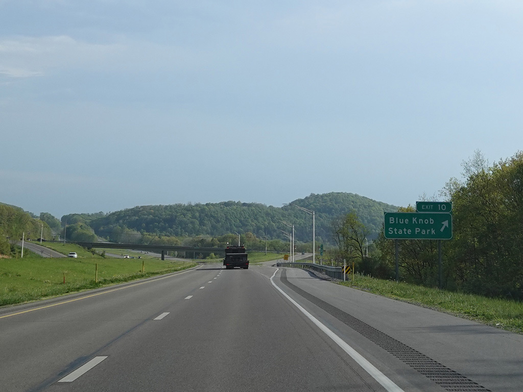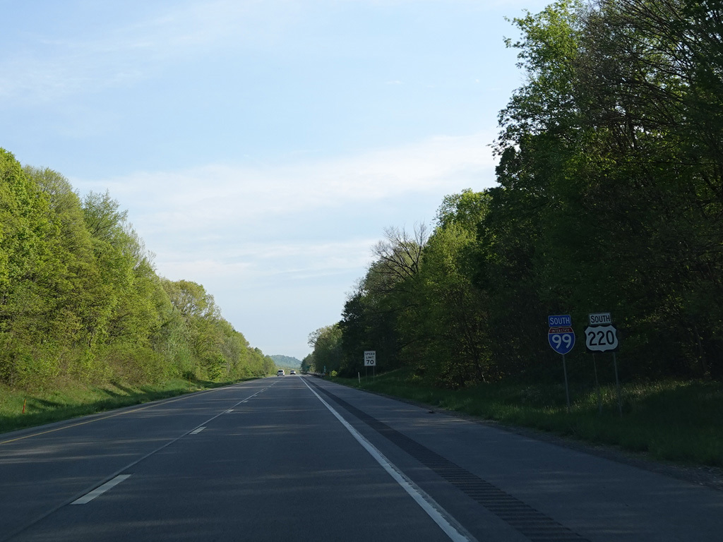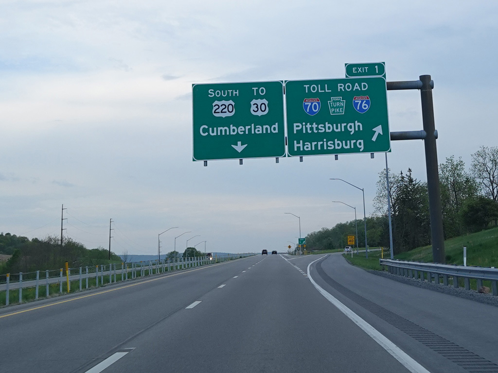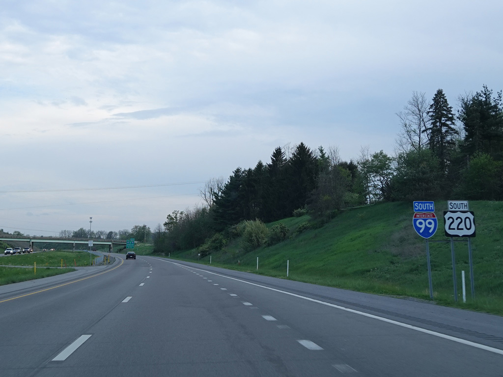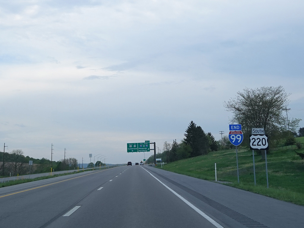 Exit 1 is for the Pennsylvania Turnpike (I-70/I-76). The exit leads to Business US 220, from which there is access to the turnpike. I-99 ends here. Continue straight ahead for US 220 south.