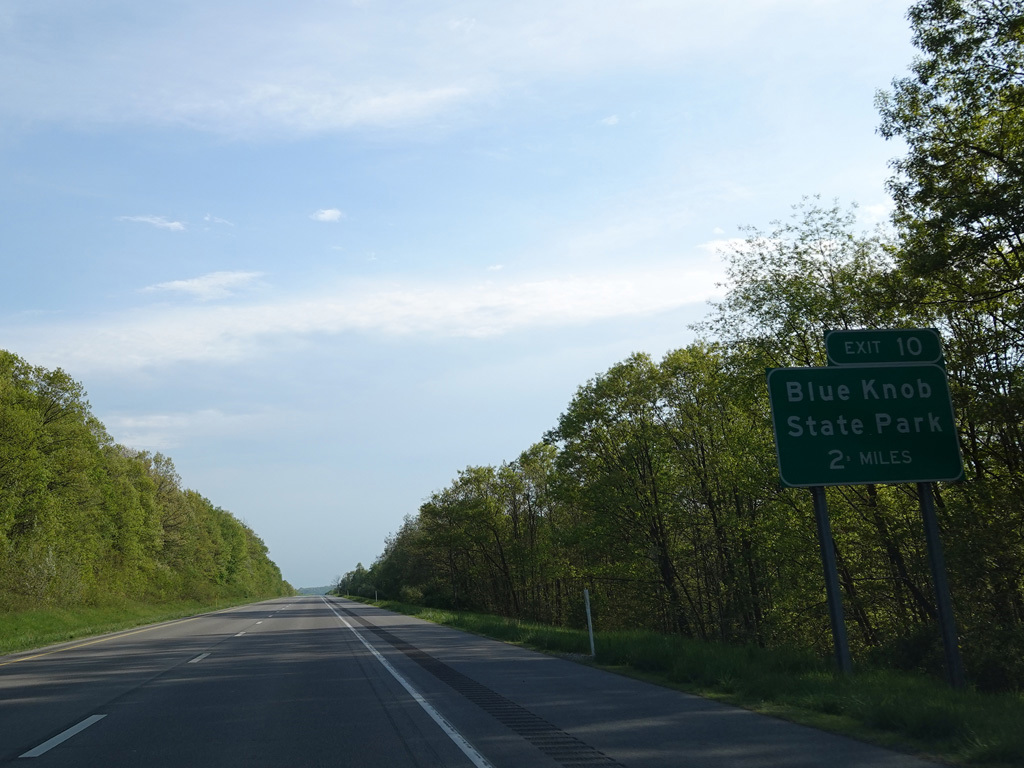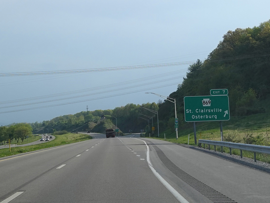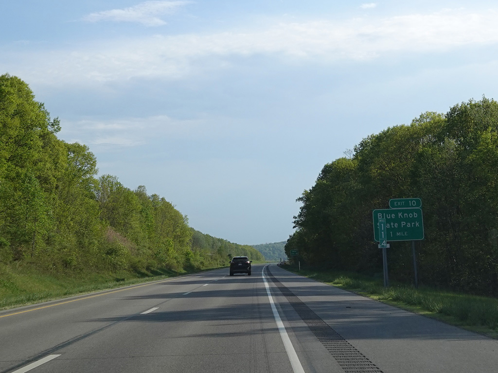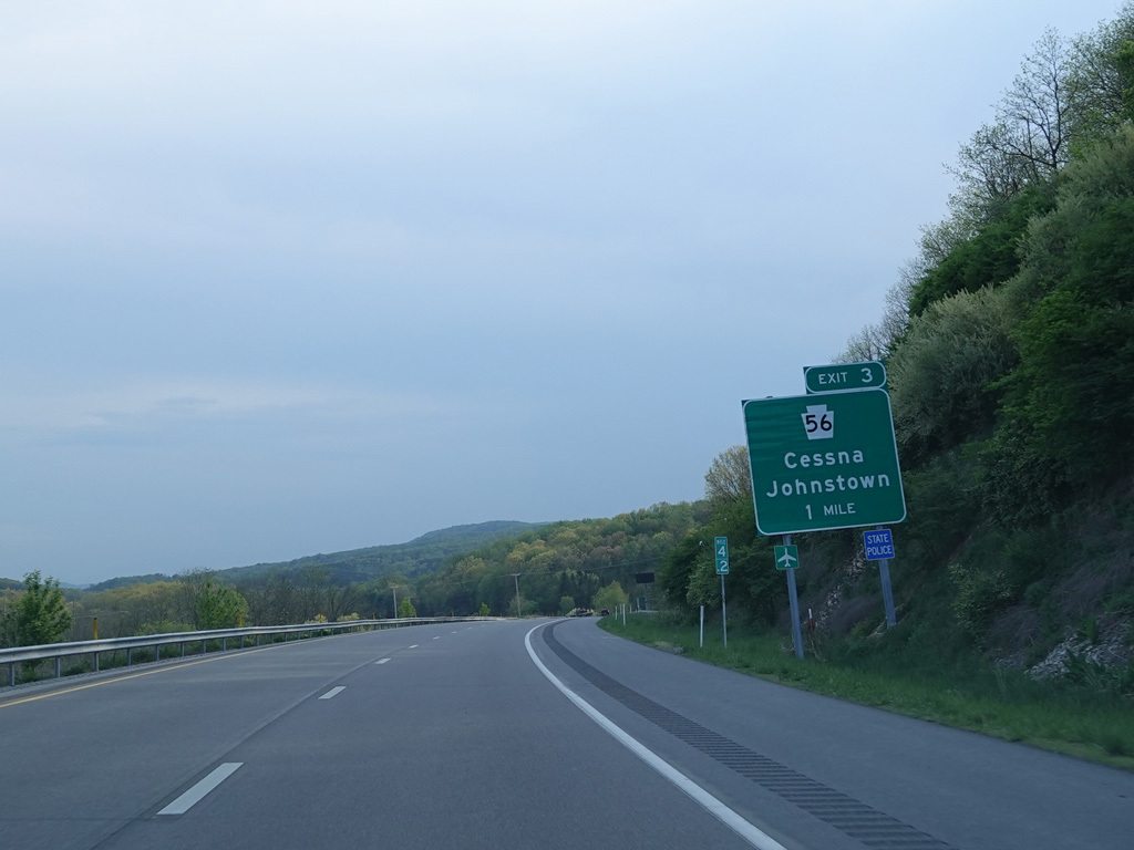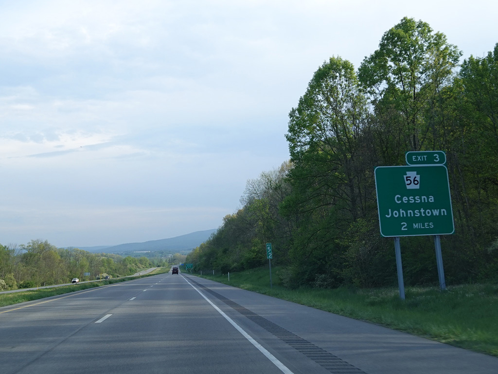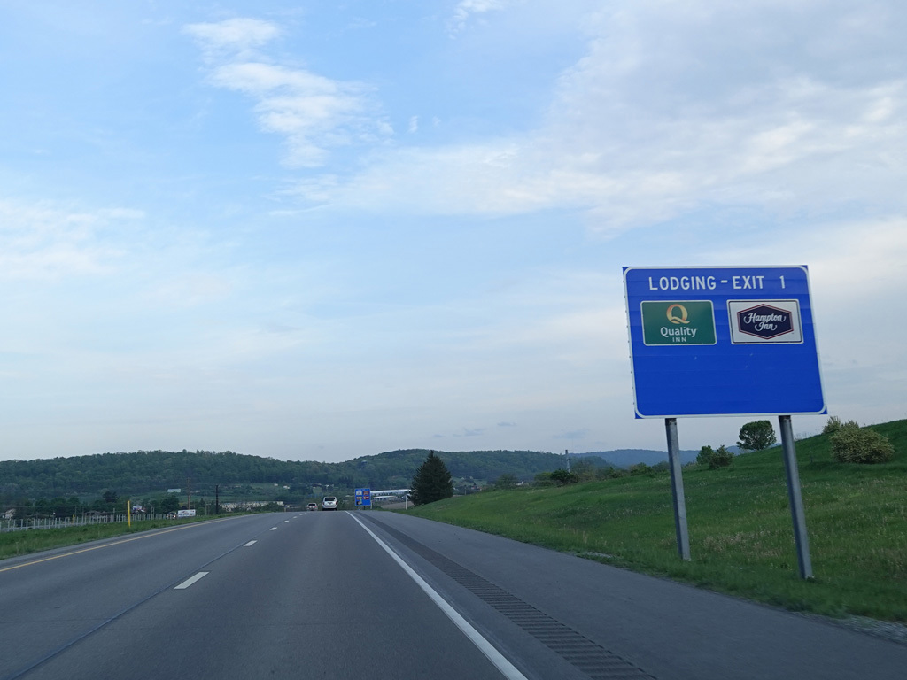 Exit 1 is for the Pennsylvania Turnpike (I-70/I-76). The exit leads to Business US 220, from which there is access to the turnpike. I-99 ends here. Continue straight ahead for US 220 south.
