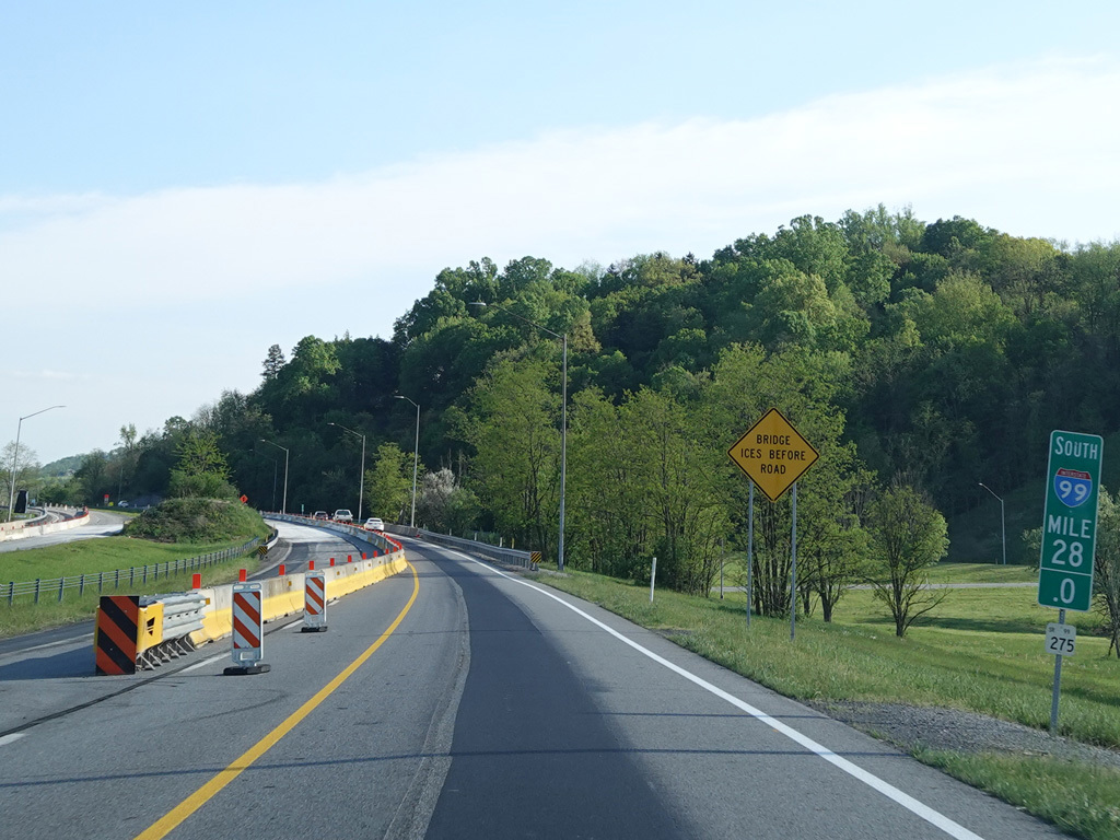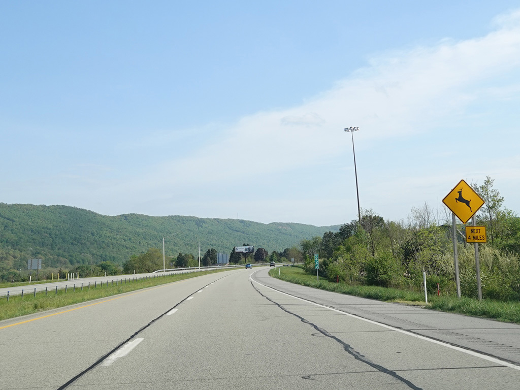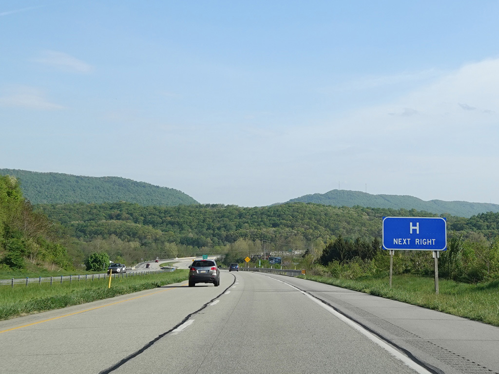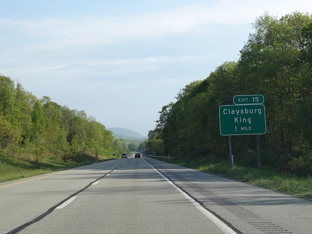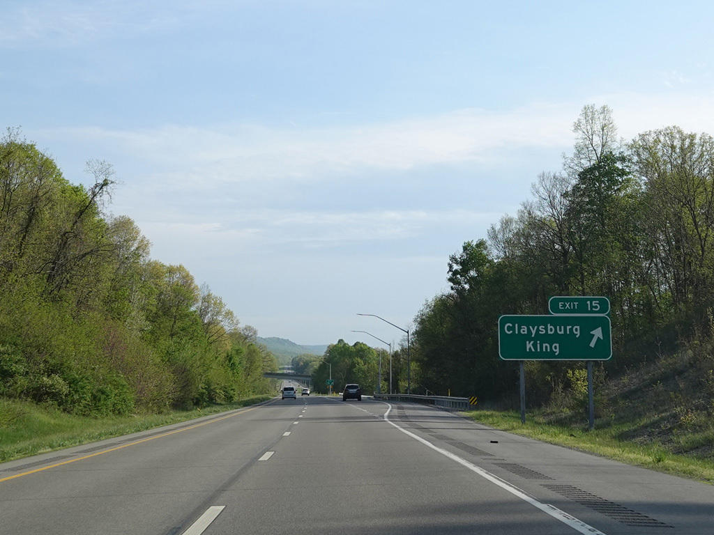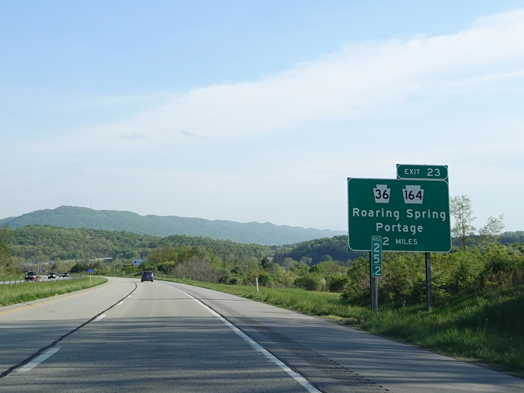 Exit 23 is for Charger Highway (PA 36), Woodbury Pike (PA 164), and Dunnings Highway (PA 164).