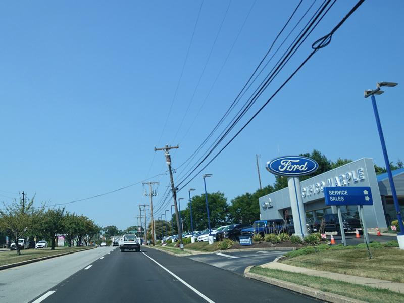 West Chester Pike runs west as a four-lane divided highway. There are traffic lights at Veterans Boulevard, New Ardmore Avenue, Berkley Road, and Church Road.