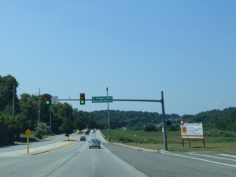 There are traffic lights at Bishop Hollow Road, Clyde Lane, Winding Way, Charles Ellis Drive, Campus Boulevard, and Alice Grim Boulevard.