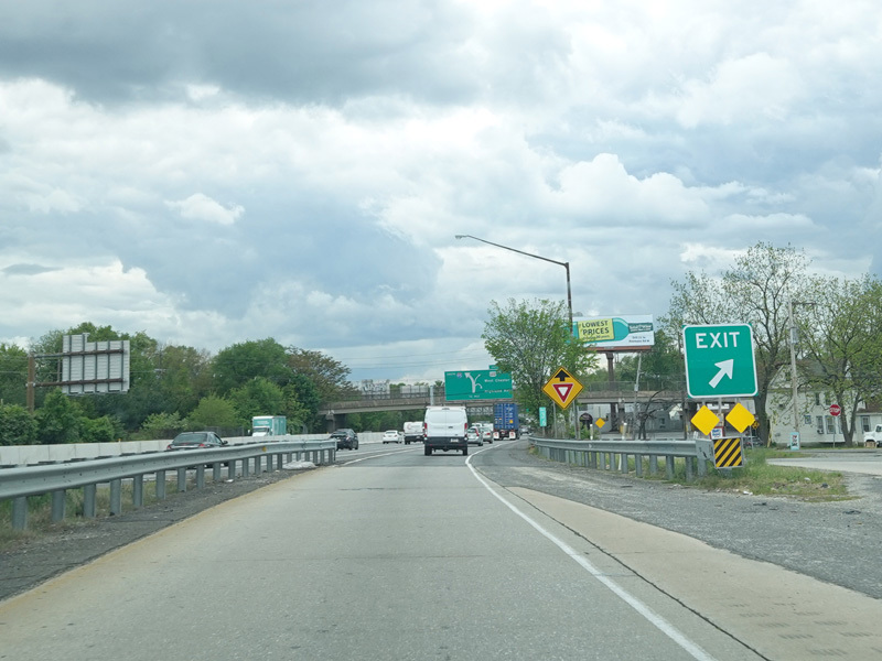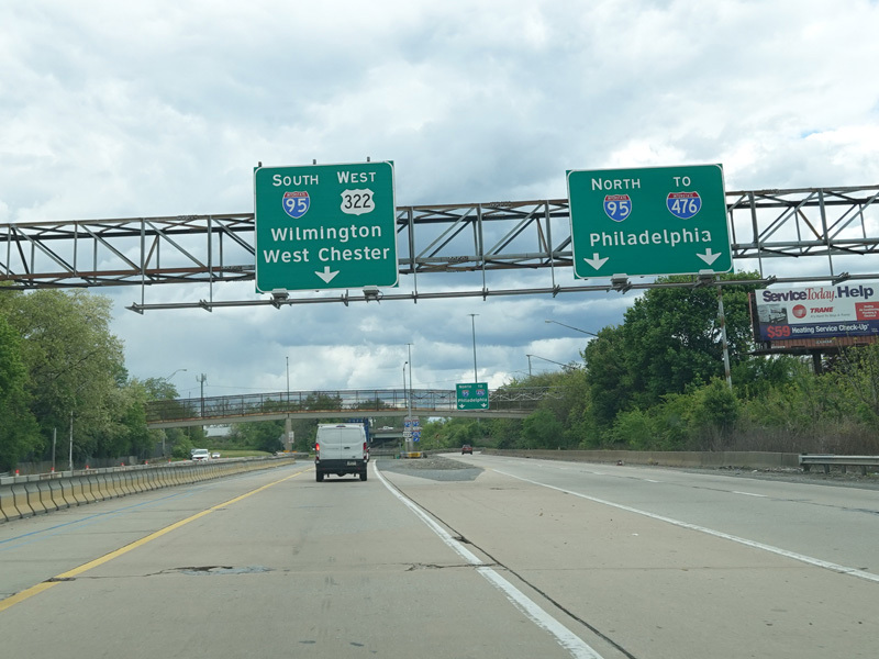 The roadway ends at an interchange at the Delaware Expressway (I-95). Bear right to go north toward the Mid-County Expressway (I-476). Bear left to go south and to stay on US 322.