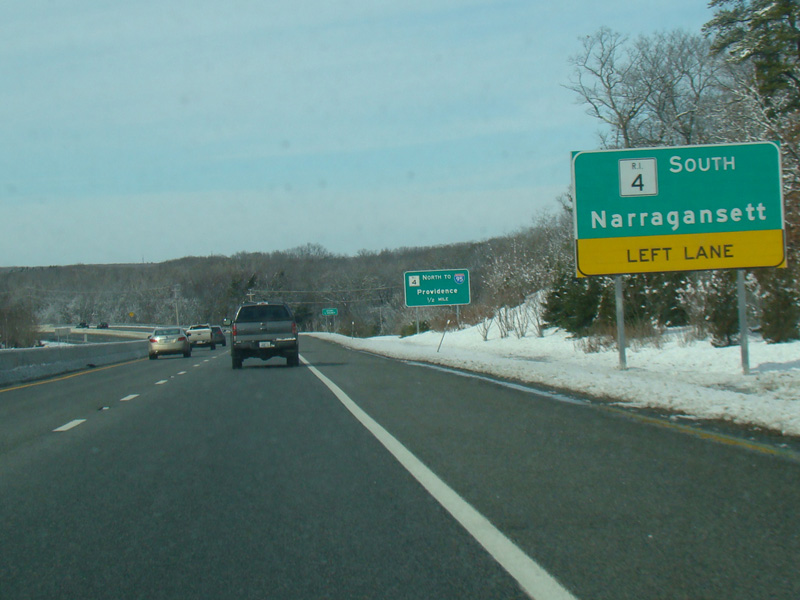 RI 403 continues west to end at the Colonel Rodman Highway (RI 4). Bear left to go south or right to go north toward I-95.