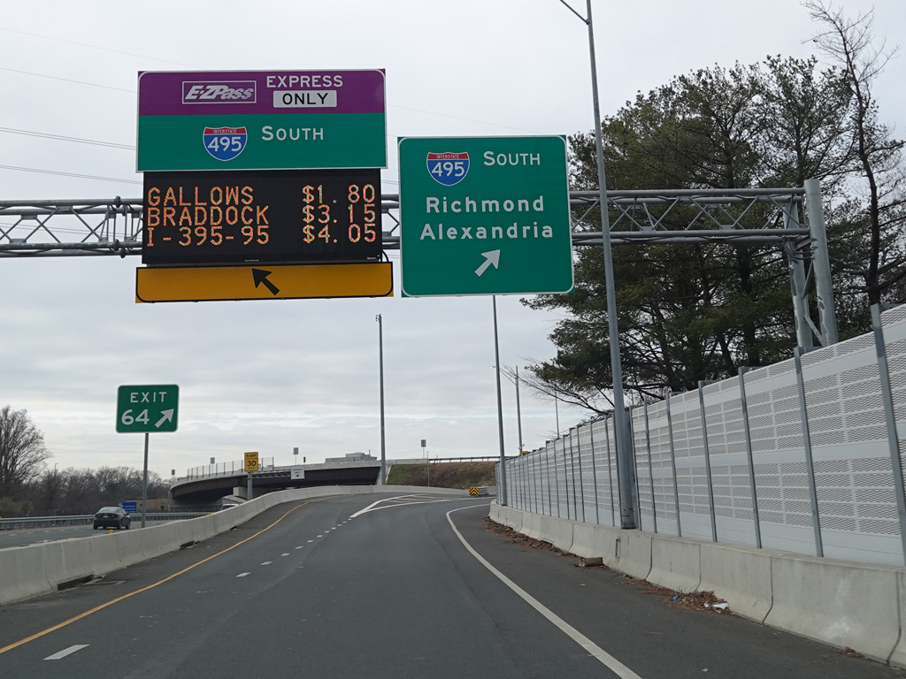 The ramp for exit 64 when travelling west splits. Bear left for the express toll lanes of the