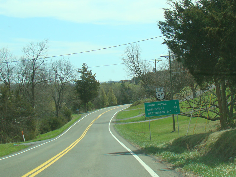 VA 55 turns east again onto King Street. Heading out of Strasburg, King Street changes names to become Front Royal Road and begins to ascend into the mountains.