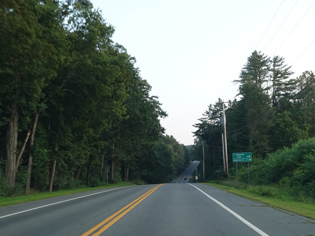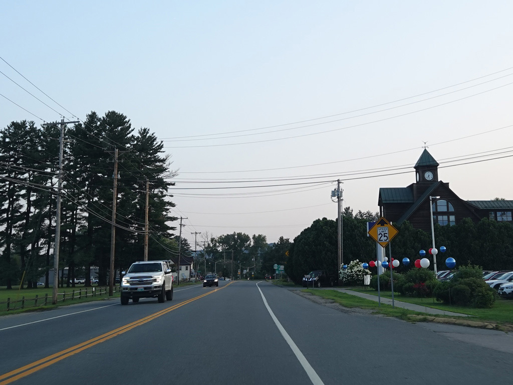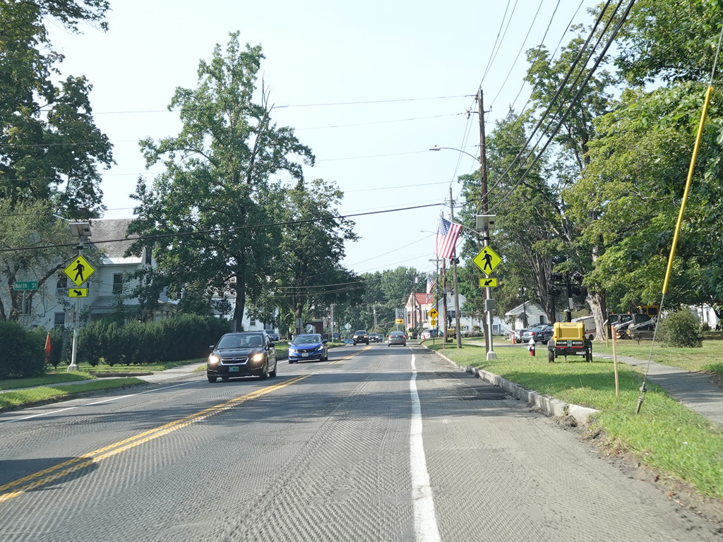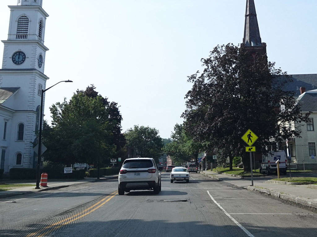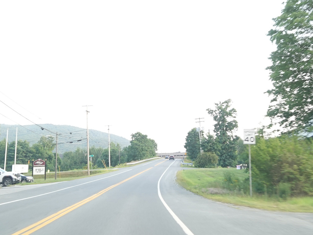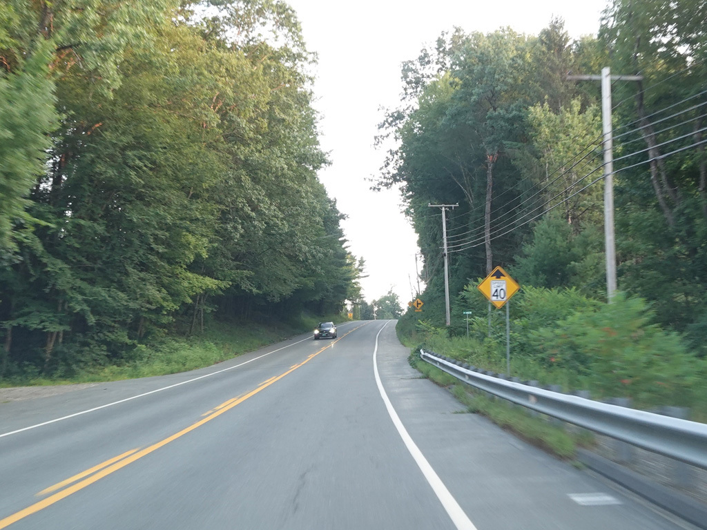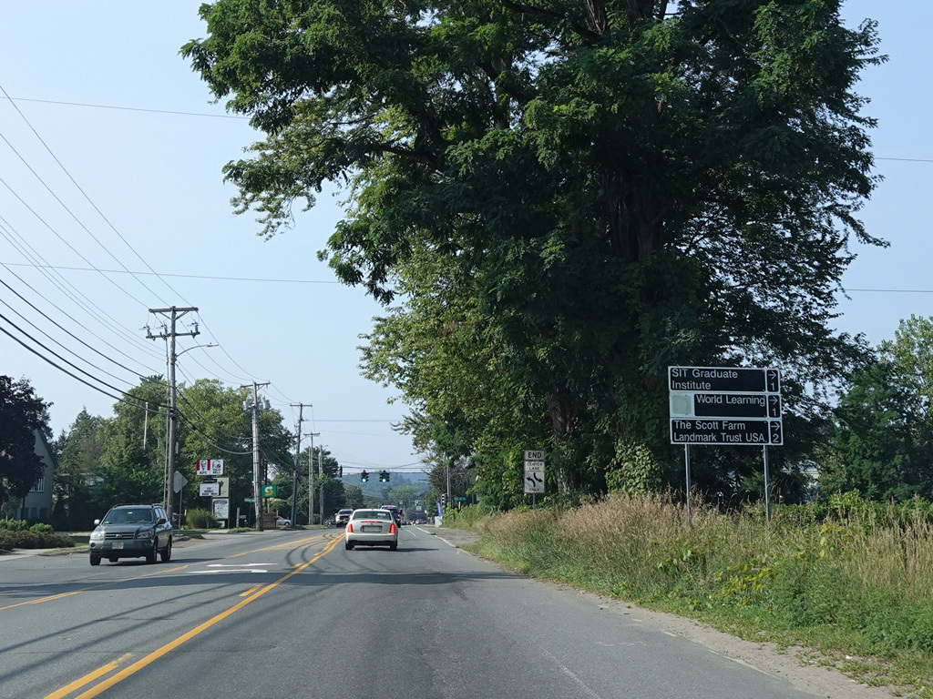 Coming into Putney, Bellows Falls Road changes names to become Main Street. The speed limit drops to 40 MPH and then to 30 MPH.