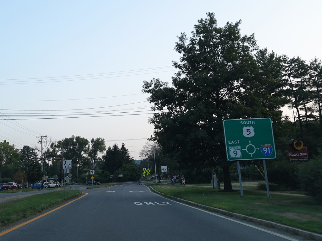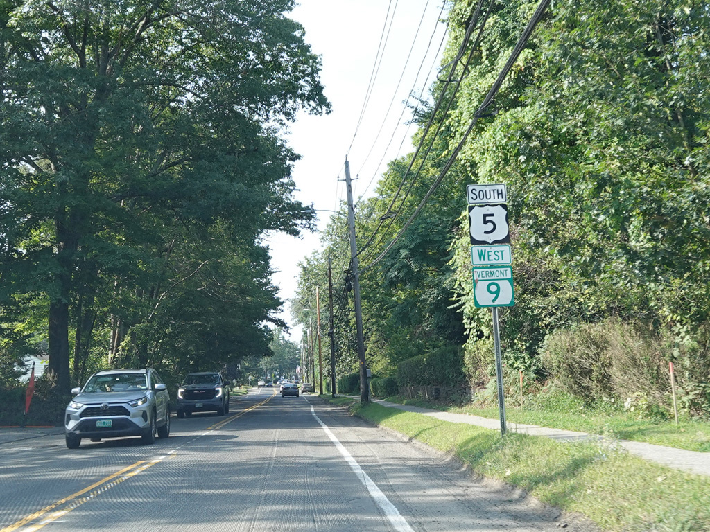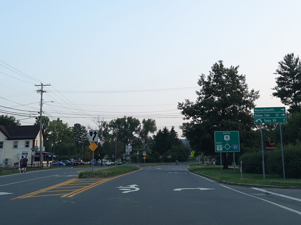 There is a roundabout at Chesterfield Road (VT 9). Westbound VT 9 is multiplexed with US 5 straight ahead, although the signage does not indicate so. There is also an entrance to I-91 at this roundabout.
