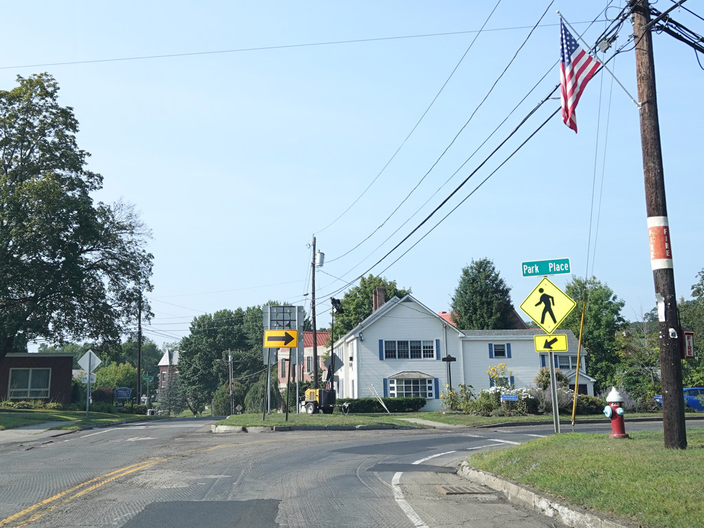 The northbound and southbound lanes split here. Bear right onto Park Place to stay on US 5/VT 9.